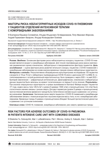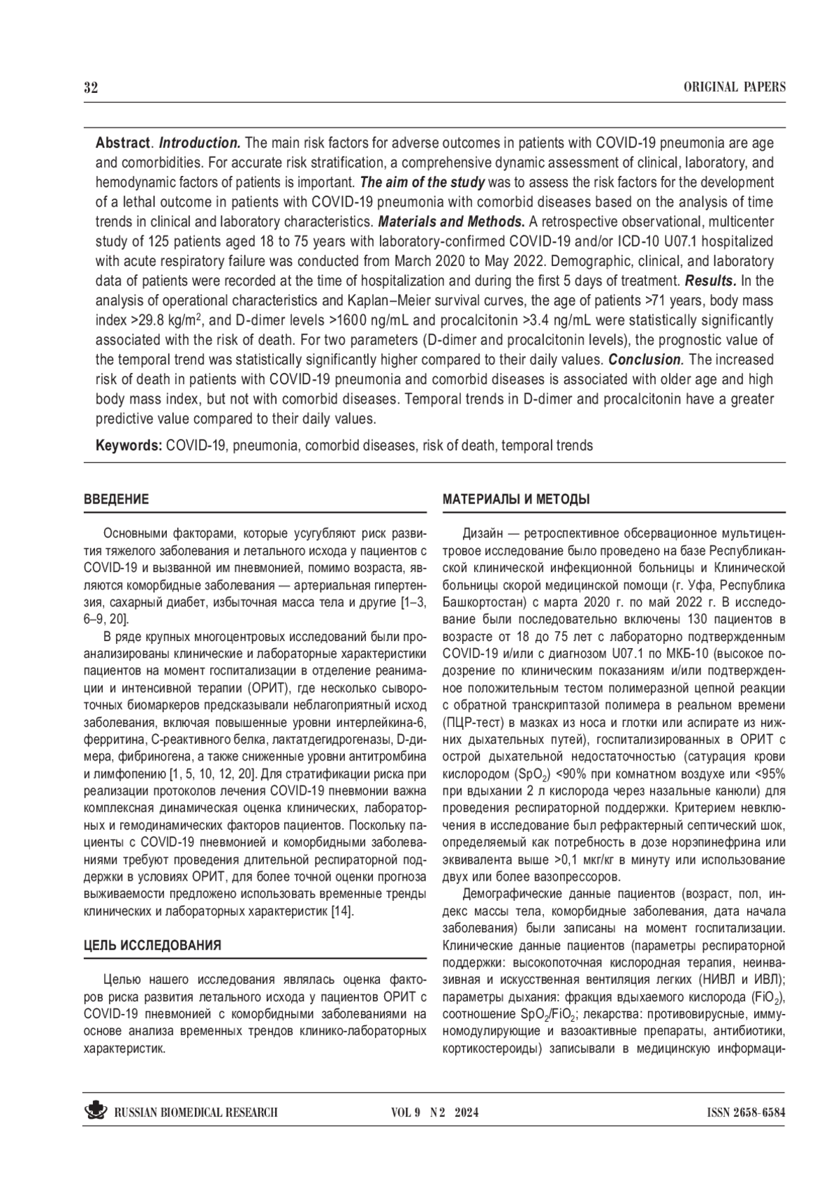 Введение. Основными факторами риска неблагоприятных исходов у пациентов с COVID-19 пневмонией являются возраст и коморбидные заболевания. Для точной стратификации риска важна комплексная динамическая оценка клинических, лабораторных и гемодинамических факторов пациентов. Цель исследования — оценка факторов риска развития летального исхода у пациентов с COVID-пневмонией с коморбидными заболеваниями на основе анализа временных трендов клинико-лабораторных характеристик. Материалы и методы. Ретроспективное обсервационное мультицентровое исследование 125 пациентов в возрасте от 18 до 75 лет с лабораторно подтвержденным COVID-19 и/или с диагнозом U07.1 по МКБ-10, госпитализированных с острой дыхательной недостаточностью, было проведено с марта 2020 г. по май 2022 г. Критерий невключения — рефрактерный септический шок. Демографические, клинические и лабораторные данные пациентов были записаны на момент госпитализации и в первые 5 суток лечения. Результаты. При анализе операционных характеристик и кривых выживаемости Каплана–Мейера возраст пациентов >71 года, индекс массы тела >29,8 кг/м2 и уровни D-димера >1600 нг/мл и прокальцитонина >3,4 нг/мл были статистически значимо связаны с риском смерти. Для двух параметров (уровни D-димера и прокальцитонина) прогностическая величина временного тренда была статистически значимо выше в сравнении с их суточными значениями. Заключение. Увеличение риска смерти пациентов с COVID-19 пневмонией и коморбидными заболеваниями связано с пожилым возрастом и высоким индексом массы тела, но не с коморбидными заболеваниями. Временные тренды D-димера и прокальцитонина обладают большей прогностической ценностью в сравнении с их суточными значениями.