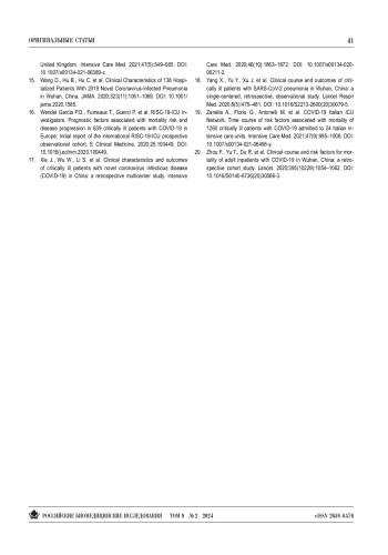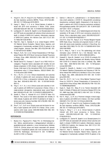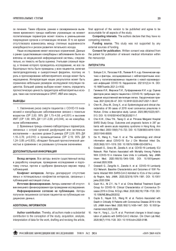 16. Wendel Garcia P.D., Fumeaux T., Guerci P. et al. RISC-19-ICU Investigators. Prognostic factors associated with mortality risk and disease progression in 639 critically ill patients with COVID-19 in Europe: Initial report of the international RISC-19-ICU prospective observational cohort. E Clinical Medicine. 2020;25:100449. DOI: 10.1016/j.eclinm.2020.100449.