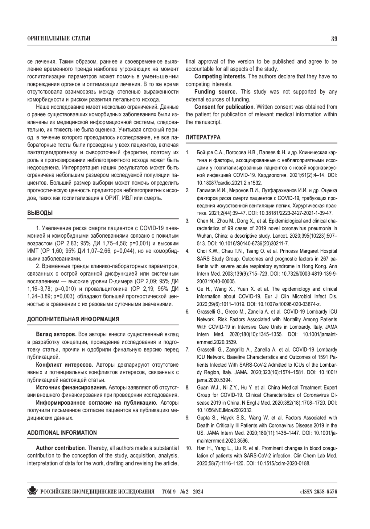 1. Бойцов С.А., Погосова Н.В., Палеев Ф.Н. и др. Клиническая картина и факторы, ассоциированные с неблагоприятными исходами у госпитализированных пациентов с новой коронавирусной инфекцией COVID-19. Кардиология. 2021;61(2):4–14. DOI: 10.18087/cardio.2021.2.n1532.