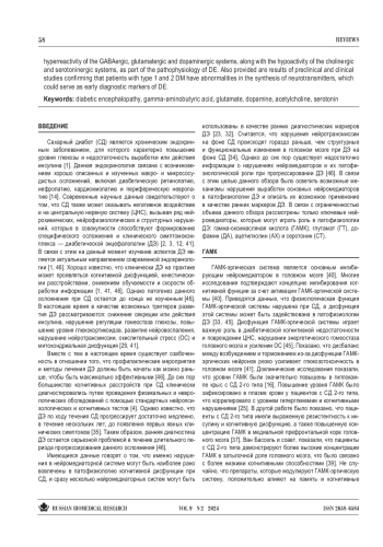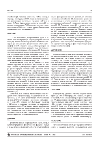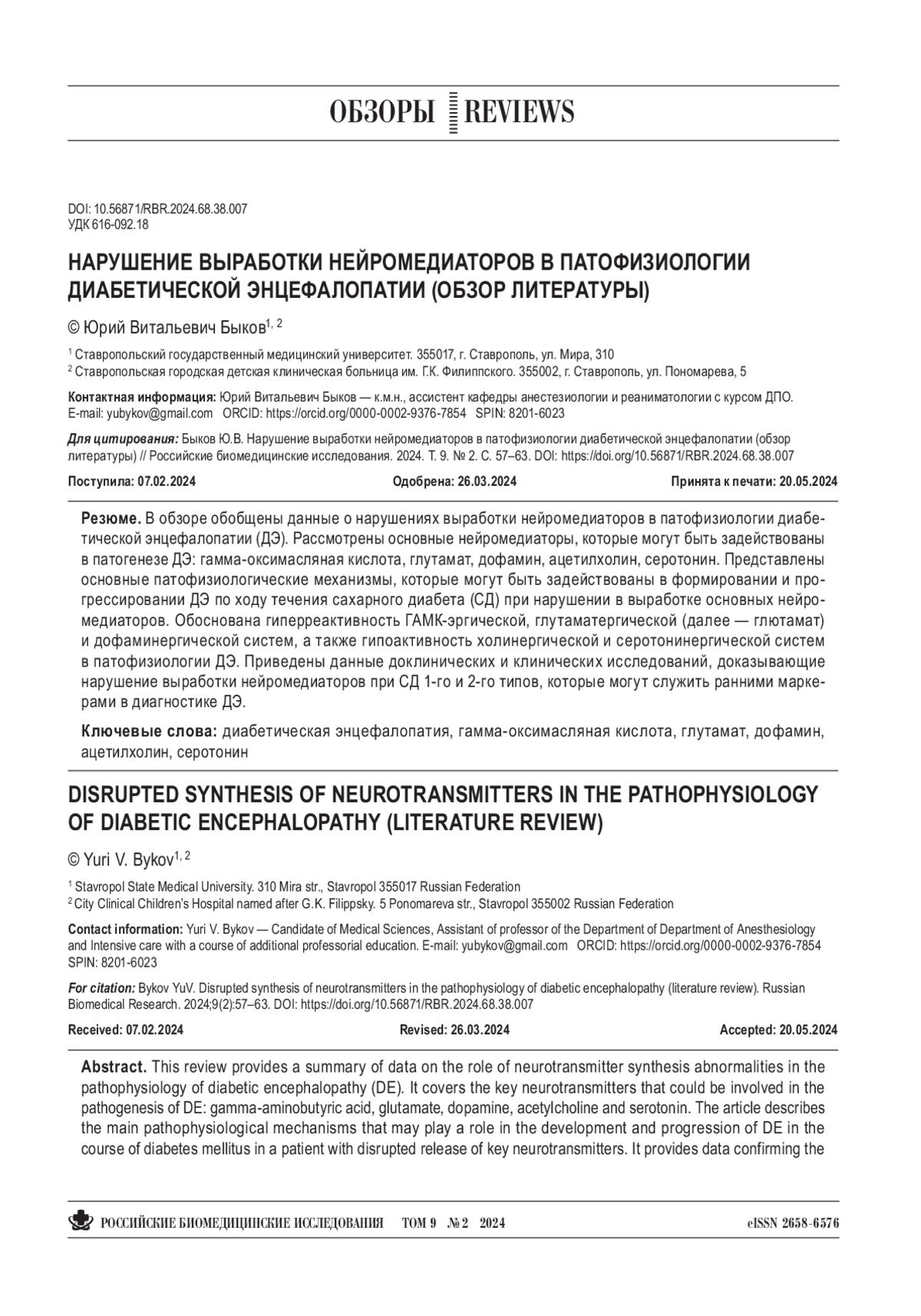 В обзоре обобщены данные о нарушениях выработки нейромедиаторов в патофизиологии диабетической энцефалопатии (ДЭ). Рассмотрены основные нейромедиаторы, которые могут быть задействованы в патогенезе ДЭ: гамма-оксимасляная кислота, глутамат, дофамин, ацетилхолин, серотонин. Представлены основные патофизиологические механизмы, которые могут быть задействованы в формировании и прогрессировании ДЭ по ходу течения сахарного диабета (СД) при нарушении в выработке основных нейромедиаторов. Обоснована гиперреактивность ГАМК-эргической, глутаматергической (далее — глютамат) и дофаминергической систем, а также гипоактивность холинергической и серотонинергической систем в патофизиологии ДЭ. Приведены данные доклинических и клинических исследований, доказывающие нарушение выработки нейромедиаторов при СД 1-го и 2-го типов, которые могут служить ранними маркерами в диагностике ДЭ.