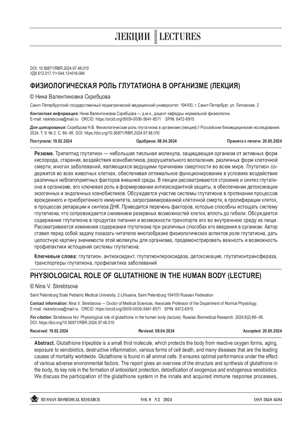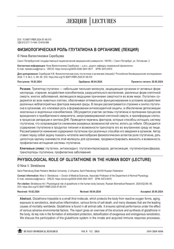 Трипептид глутатион — небольшая тиольная молекула, защищающая организм от активных форм кислорода, старения, воздействия ксенобиотиков, разрушительного воспаления, различных форм клеточной смерти, многих заболеваний, являющихся ведущими причинами смертности во всем мире. Глутатион содержится во всех животных клетках, обеспечивая оптимальное функционирование в условиях воздействия различных неблагоприятных факторов внешней среды. В лекции рассматриваются строение и синтез глутатиона в организме, его ключевая роль в формировании антиоксидантной защиты, в обеспечении детоксикации экзогенных и эндогенных ксенобиотиков. Обсуждается участие системы глутатиона в протекании процессов врожденного и приобретенного иммунитета, запрограммированной клеточной смерти, в пролиферации клеток, в процессах репарации и синтеза ДНК. Приводится перечень факторов, которые способны истощать систему глутатиона, что сопровождается снижением резервных возможностей клетки, вплоть до гибели. Обсуждается содержание глутатиона в продуктах питания и возможности транспорта его во внутреннюю среду из пищи. Рассматриваются изменения содержания глутатиона при различных способах его введения в организм. Автор ставил перед собой задачу показать читателю многообразие физиологических аспектов роли глутатиона, дать целостную картину значимости этой молекулы для организма, продемонстрировать важность и возможность профилактики истощения системы глутатиона.