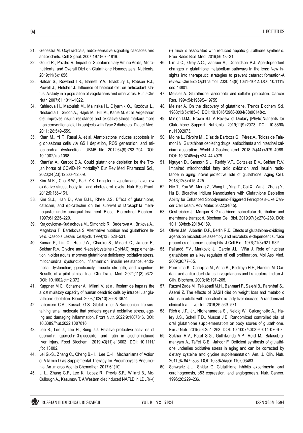 32. Gould R., Pazdro R. Impact of Supplementary Amino Acids, Micronutrients, and Overall Diet on Glutathione Homeostasis. Nutrients. 2019;11(5):1056.