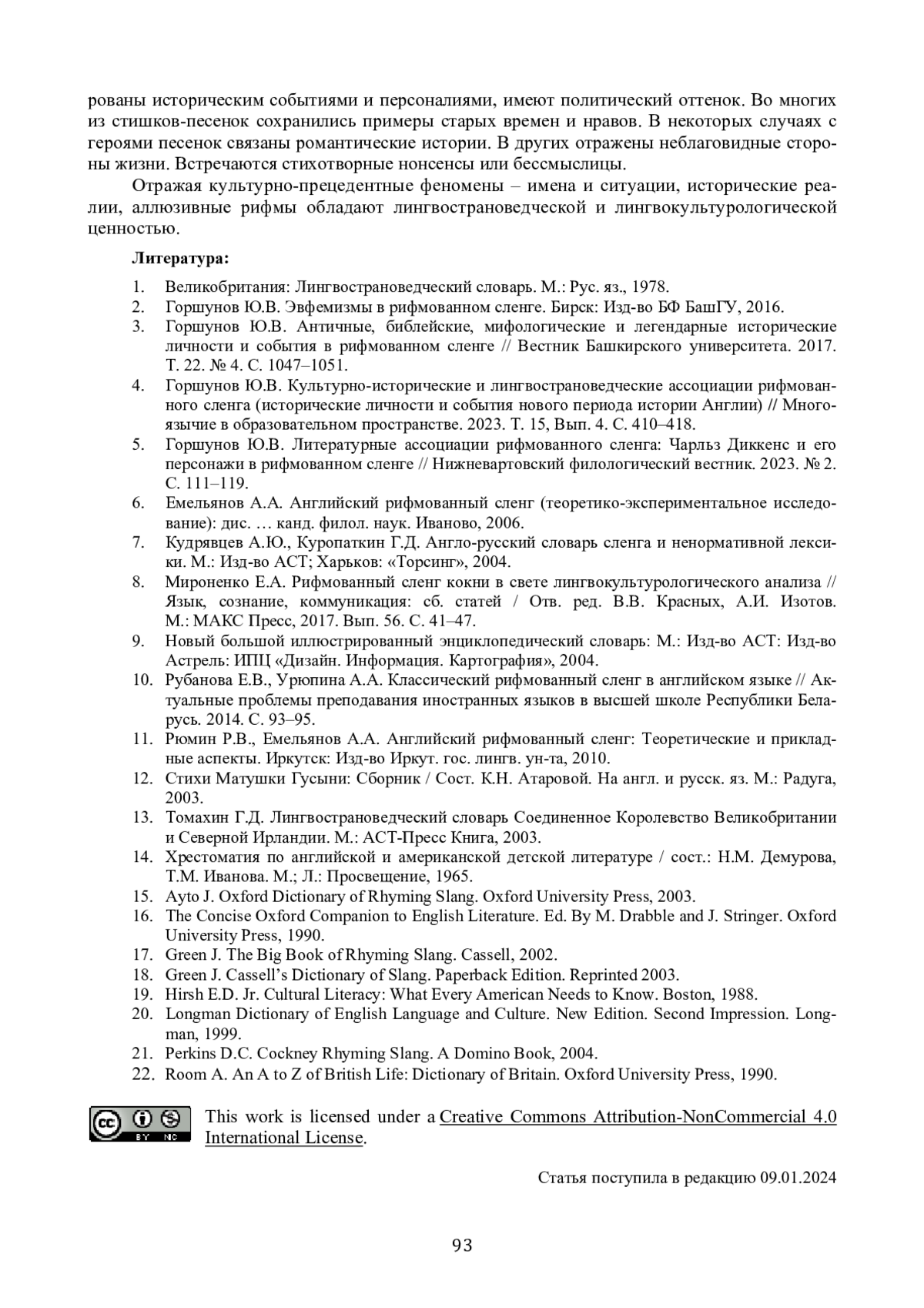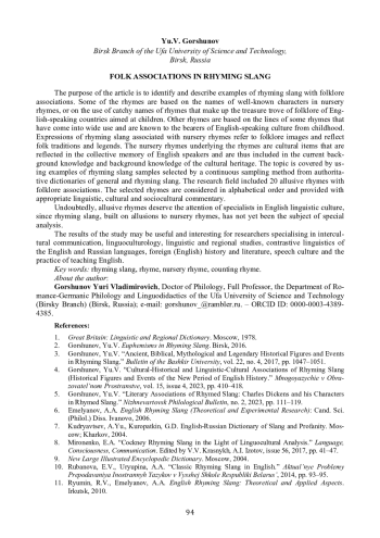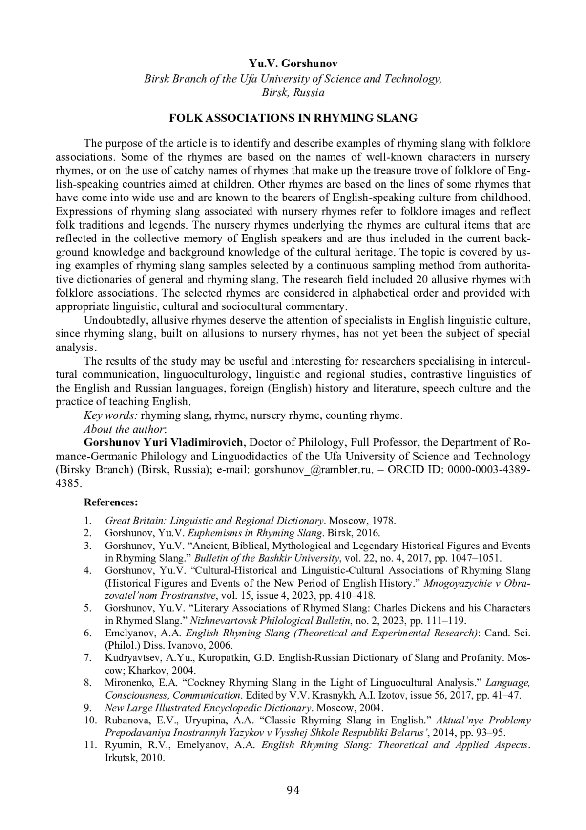 4. Горшунов Ю.В. Культурно-исторические и лингвострановедческие ассоциации рифмованного сленга (исторические личности и события нового периода истории Англии) // Многоязычие в образовательном пространстве. 2023. Т. 15, Вып. 4. С. 410-418. EDN: HVQGQO