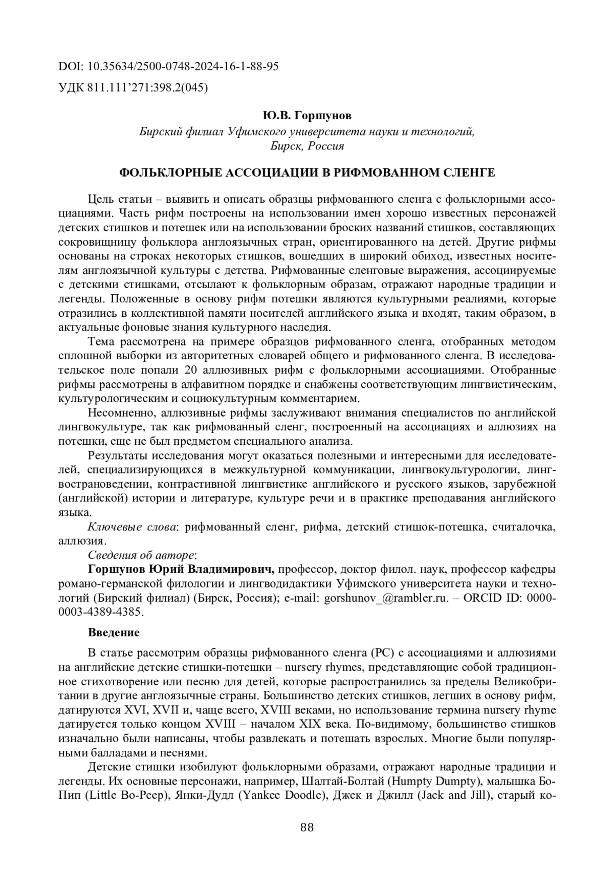 Цель статьи - выявить и описать образцы рифмованного сленга с фольклорными ассоциациями. Часть рифм построены на использовании имен хорошо известных персонажей детских стишков и потешек или на использовании броских названий стишков, составляющих сокровищницу фольклора англоязычных стран, ориентированного на детей. Другие рифмы основаны на строках некоторых стишков, вошедших в широкий обиход, известных носителям англоязычной культуры с детства. Рифмованные сленговые выражения, ассоциируемые с детскими стишками, отсылают к фольклорным образам, отражают народные традиции и легенды. Положенные в основу рифм потешки являются культурными реалиями, которые отразились в коллективной памяти носителей английского языка и входят, таким образом, в актуальные фоновые знания культурного наследия. Тема рассмотрена на примере образцов рифмованного сленга, отобранных методом сплошной выборки из авторитетных словарей общего и рифмованного сленга. В исследовательское поле попали 20 аллюзивных рифм с фольклорными ассоциациями. отобранные рифмы рассмотрены в алфавитном порядке и снабжены соответствующим лингвистическим, культурологическим и социокультурным комментарием. несомненно, аллюзивные рифмы заслуживают внимания специалистов по английской лингвокультуре, так как рифмованный сленг, построенный на ассоциациях и аллюзиях на потешки, еще не был предметом специального анализа. Результаты исследования могут оказаться полезными и интересными для исследователей, специализирующихся в межкультурной коммуникации, лингвокультурологии, лингвострановедении, контрастивной лингвистике английского и русского языков, зарубежной (английской) истории и литературе, культуре речи и в практике преподавания английского языка.