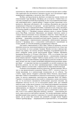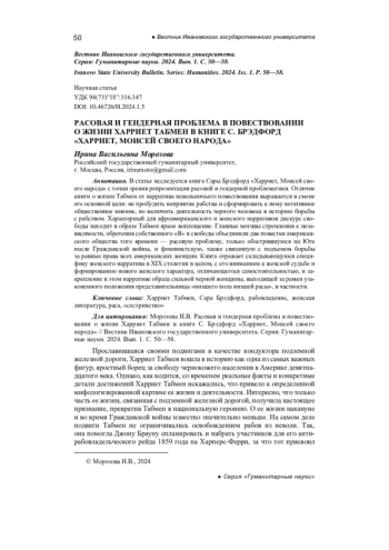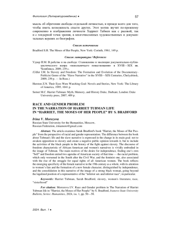 В статье исследуется книга Сары Брэдфорд «Харриет, Моисей своего народа» с точки зрения репрезентации расовой и гендерной проблематики. Отличие книги о жизни Табмен от нарратива невольничьего повествования выражается в смене его основной цели: не пробудить неприятие рабства и сформировать к нему негативное общественное мнение, но включить деятельность черного человека в историю борьбы с рабством. Характерный для афроамериканского и женского нарративов дискурс свободы находит в образе Табмен яркое воплощение. Главные мотивы стремления к независимости, обретения собственного «Я» и свободы объединили две повестки американского общества того времени - расовую проблему, только обострившуюся на Юге после Гражданской войны, и феминистскую, также связанную с подъемом борьбы за равные права всех американских женщин. Книга отражает складывающуюся специфику женского нарратива в XIX столетии в целом, с его вниманием к женской судьбе и формированию нового женского характера, отличающегося самостоятельностью, и закрепление в этом нарративе образа сильной черной женщины, выходящей за рамки узаконенного положения представительницы «низшего пола низшей расы», в частности.