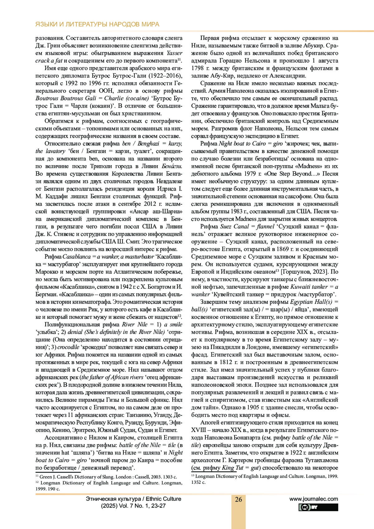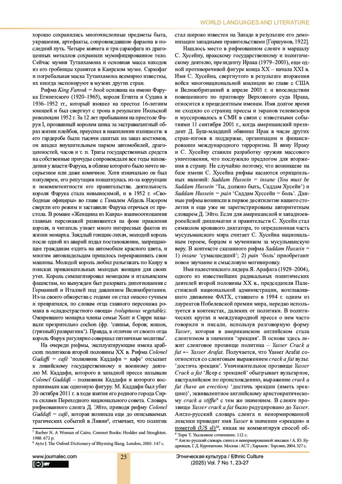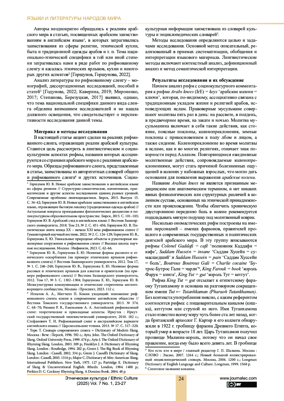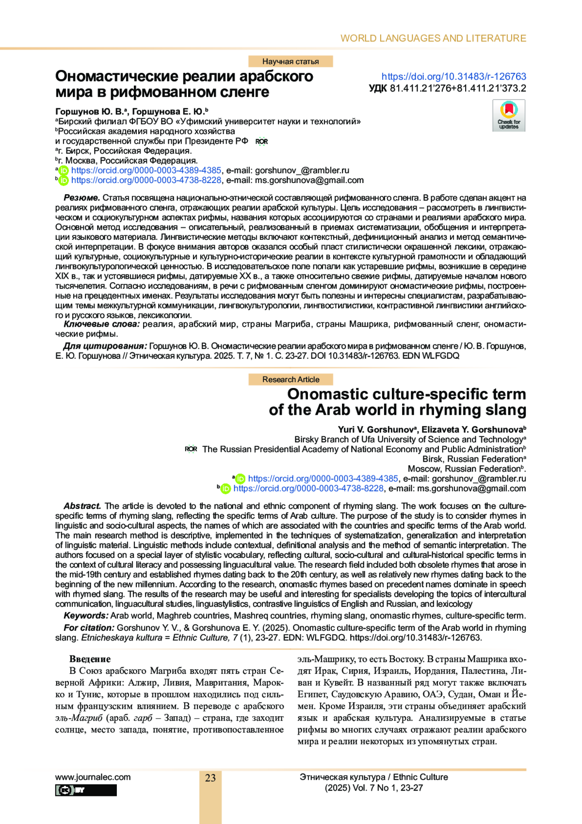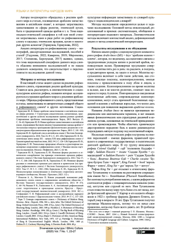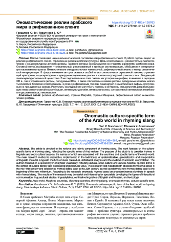 Статья посвящена национально-этнической составляющей рифмованного сленга. В работе сделан акцент на реалиях рифмованного сленга, отражающих реалии арабской культуры. Цель исследования - рассмотреть в лингвистическом и социокультурном аспектах рифмы, названия которых ассоциируются со странами и реалиями арабского мира. Основной метод исследования - описательный, реализованный в приемах систематизации, обобщения и интерпретации языкового материала. Лингвистические методы включают контекстный, дефиниционный анализ и метод семантической интерпретации. В фокусе внимания авторов оказался особый пласт стилистически окрашенной лексики, отражающий культурные, социокультурные и культурно-исторические реалии в контексте культурной грамотности и обладающий лингвокультурологической ценностью. В исследовательское поле попали как устаревшие рифмы, возникшие в середине XIX в., так и устоявшиеся рифмы, датируемые XX в., а также относительно свежие рифмы, датируемые началом нового тысячелетия. Согласно исследованиям, в речи с рифмованным сленгом доминируют ономастические рифмы, построенные на прецедентных именах. Результаты исследования могут быть полезны и интересны специалистам, разрабатывающим темы межкультурной коммуникации, лингвокультурологии, лингвостилистики, контрастивной лингвистики английского и русского языков, лексикологии.