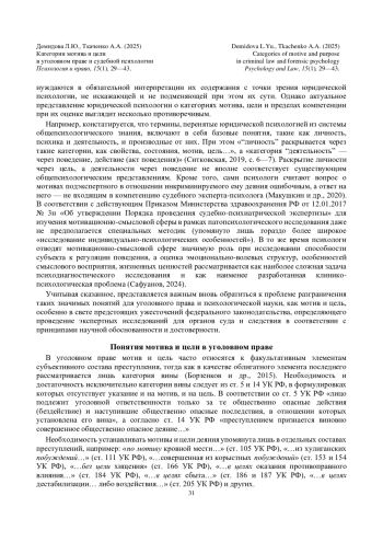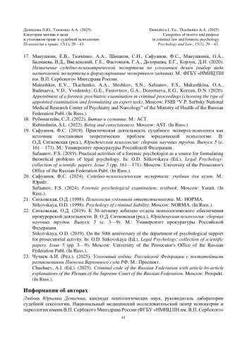 Sitkovskaya, O.D. (2019). On the 50th anniversary of the department of psychological support for prosecutorial activity. In: O.D. Sitkovskaya (Ed.), Legal Psychology: collection of scientific papers. Issue 5 (pp. 3—9). Moscow: University of the Prosecutor’s Office of the Russian Federation Publ. (In Russ.). - Чучаев А.И. (Ред.). (2025). Уголовный кодекс Российской Федерации с постатейными разъяснениями Пленума Верховного cуда РФ. М.: Проспект.