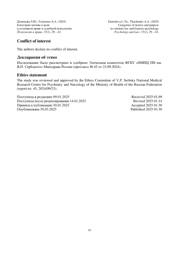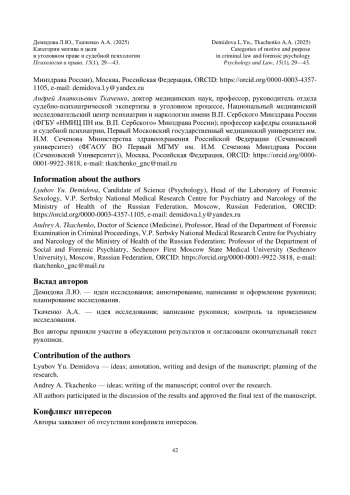Iljin, E.P. (2002). Motivation and motives. Saint Petersburg: Piter. (In Russ.). - Коченов, М.М. (2010). Судебно-психологическая экспертиза: теория и практика. Избранные труды. М.: Генезис.