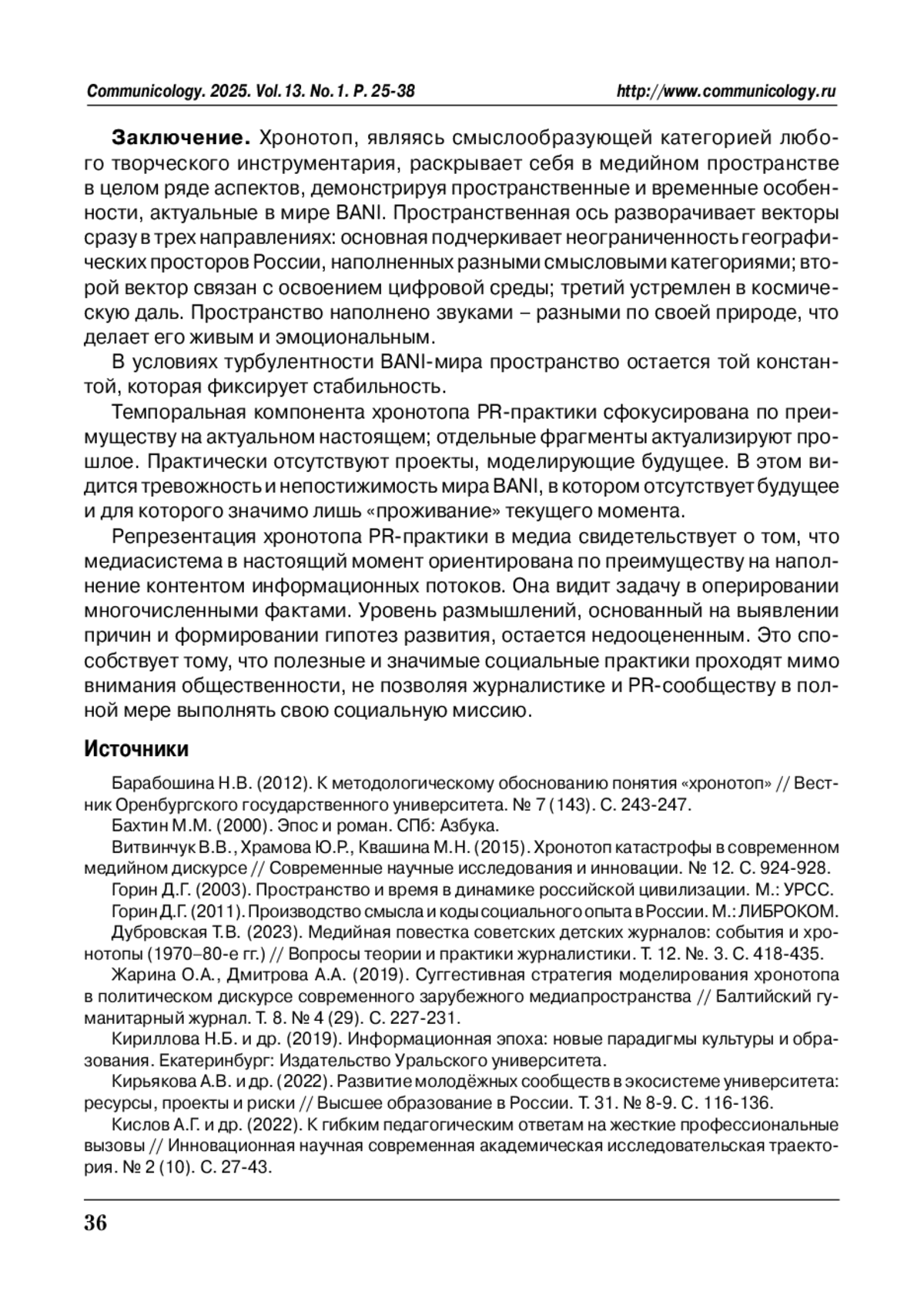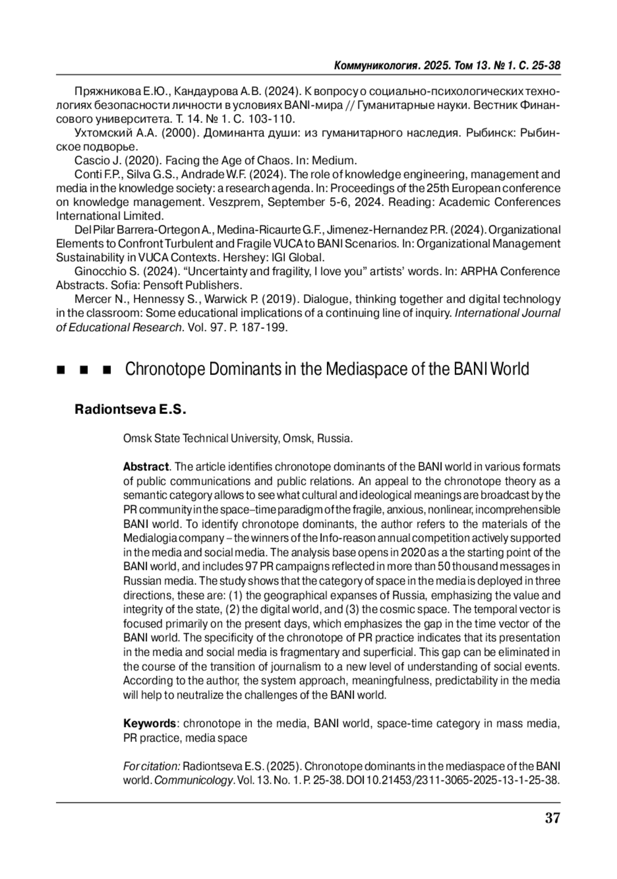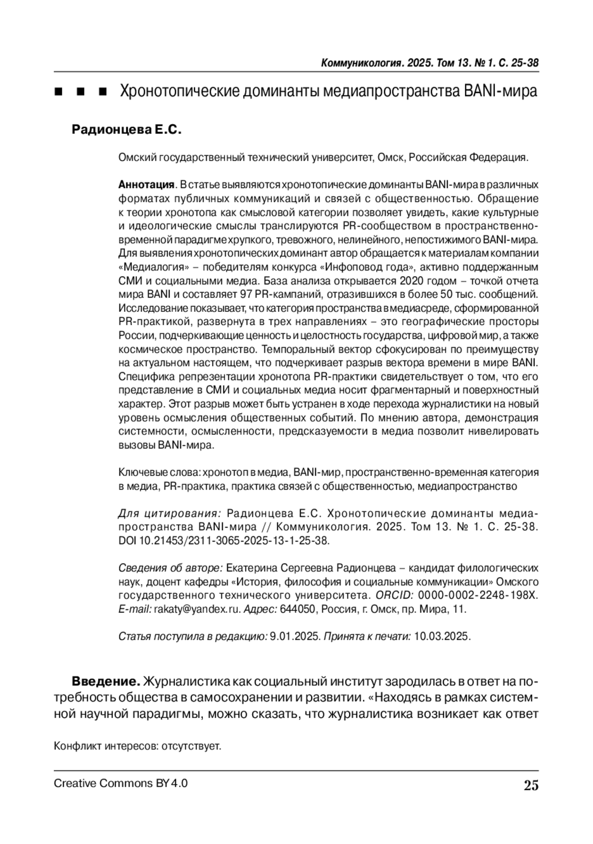 В статье выявляются хронотопические доминанты BANI-мира в различных форматах публичных коммуникаций и связей с общественностью. Обращение к теории хронотопа как смысловой категории позволяет увидеть, какие культурные и идеологические смыслы транслируются PR-сообществом в пространственновременной парадигме хрупкого, тревожного, нелинейного, непостижимого BANI-мира. Для выявления хронотопических доминант автор обращается к материалам компании «Медиалогия» – победителям конкурса «Инфоповод года», активно поддержанным СМИ и социальными медиа. База анализа открывается 2020 годом – точкой отчета мира BANI и составляет 97 PR-кампаний, отразившихся в более 50 тыс. сообщений. Исследование показывает, что категория пространства в медиасреде, сформированной PR-практикой, развернута в трех направлениях – это географические просторы России, подчеркивающие ценность и целостность государства, цифровой мир, а также космическое пространство. Темпоральный вектор сфокусирован по преимуществу на актуальном настоящем, что подчеркивает разрыв вектора времени в мире BANI. Специфика репрезентации хронотопа PR-практики свидетельствует о том, что его представление в СМИ и социальных медиа носит фрагментарный и поверхностный характер. Этот разрыв может быть устранен в ходе перехода журналистики на новый уровень осмысления общественных событий. По мнению автора, демонстрация системности, осмысленности, предсказуемости в медиа позволит нивелировать вызовы BANI-мира.