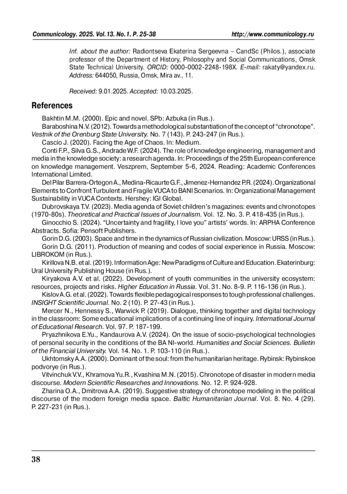 6. Дубровская Т.В. (2023). Медийная повестка советских детских журналов: события и хронотопы (1970-80-е гг.) // Вопросы теории и практики журналистики. Т. 12. №. 3. С. 418-435.