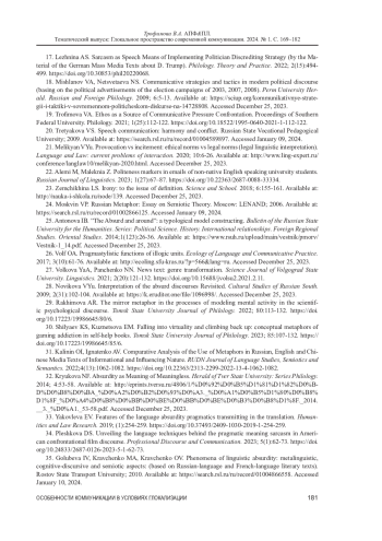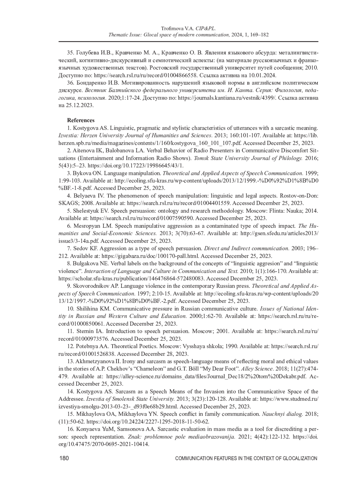 16. Коняева Ю.М., Самсонова А.А. Саркастическая оценка в массмедиа как инструмент дискредитации личности: речевая репрезентация. Знак: проблемное поле медиаобразования. 2021;4(42):122-132. DOI: 10.47475/2070-0695-2021-10414 EDN: TFCTQP
