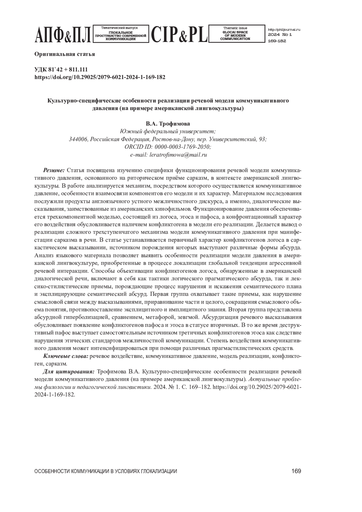 Статья посвящена изучению специфики функционирования речевой модели коммуникативного давления, основанного на риторическом приёме сарказм, в контексте американской лингвокультуры. В работе анализируется механизм, посредством которого осуществляется коммуникативное давление, особенности взаимосвязи компонентов его модели и их характер. Материалом исследования послужили продукты англоязычного устного межличностного дискурса, а именно, диалогические высказывания, заимствованные из американских кинофильмов. Функционирование давления обеспечивается трехкомпонентной моделью, состоящей из логоса, этоса и пафоса, а конфронтационный характер его воздействия обусловливается наличием конфликтогена в модели его реализации. Делается вывод о реализации сложного трехступенчатого механизма модели коммуникативного давления при манифестации сарказма в речи. В статье устанавливается первичный характер конфликтогенов логоса в саркастическом высказывании, источником порождения которых выступают различные формы абсурда. Анализ языкового материала позволяет выявить особенности реализации модели давления в американской лингвокультуре, приобретенные в процессе локализации глобальной тенденции агрессивной речевой интеракции. Способы объективации конфликтогенов логоса, обнаруженные в американской диалогической речи, включают в себя как тактики логического прагматического абсурда, так и лексико-стилистические приемы, порождающие процесс нарушения и искажения семантического плана и эксплицирующие семантический абсурд. Первая группа охватывает такие приемы, как нарушение смысловой связи между высказываниями, приравнивание части и целого, сокращения смыслового объема понятия, противопоставление эксплицитного и имплицитного знания. Вторая группа представлена абсурдной гиперболизацией, сравнением, метафорой, зевгмой. Абсурдизация речевого высказывания обусловливает появление конфликтогенов пафоса и этоса в статусе вторичных. В то же время деструктивный пафос выступает самостоятельным источником третичных конфликтогенов этоса как следствие нарушения этических стандартов межличностной коммуникации. Степень воздействия коммуникативного давления может интенсифицироваться при помощи различных прагмастилистических средств.