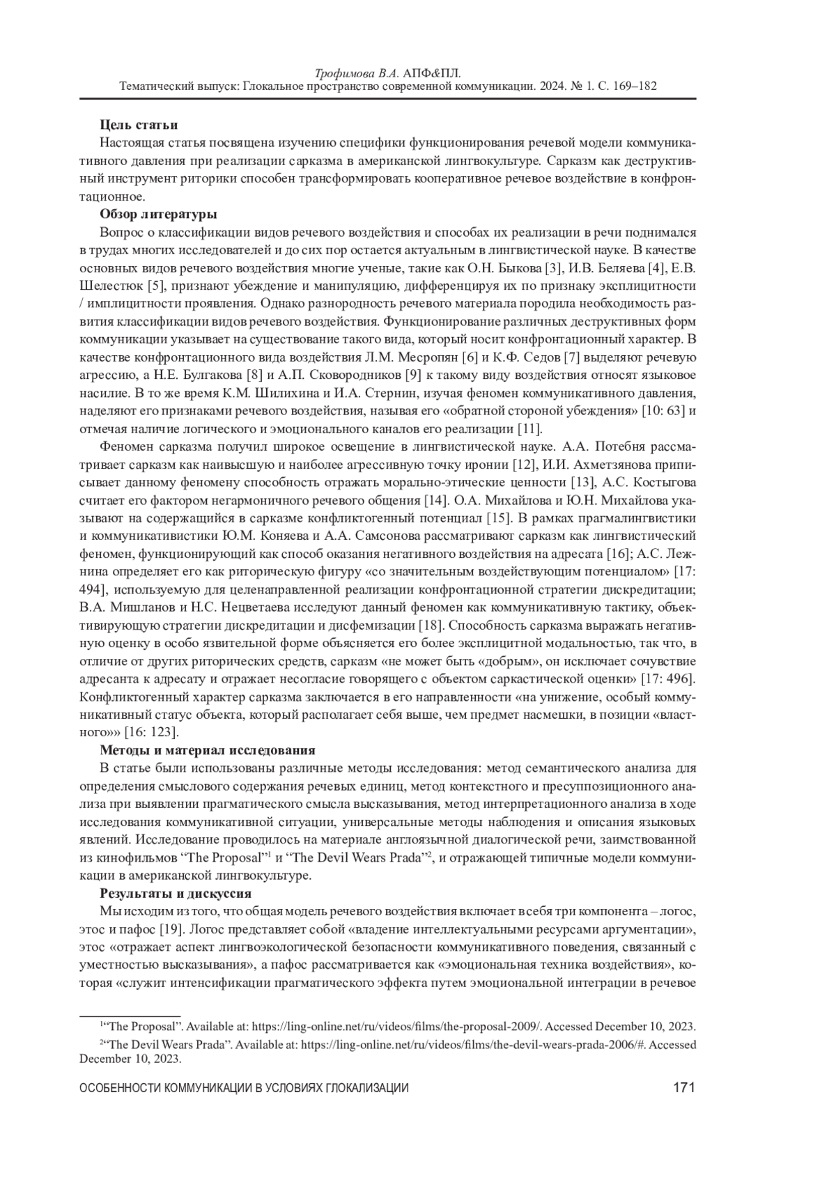 34. Плешкова Д.С. Сарказм в американском конфронтационном кинодискурсе: способы вербализации и проблемы перевода на русский язык. Дискурс профессиональной коммуникации. 2023;5(1):62-73. DOI: 10.24833/2687-0126-2023-5-1-62-73 EDN: SWKGBS