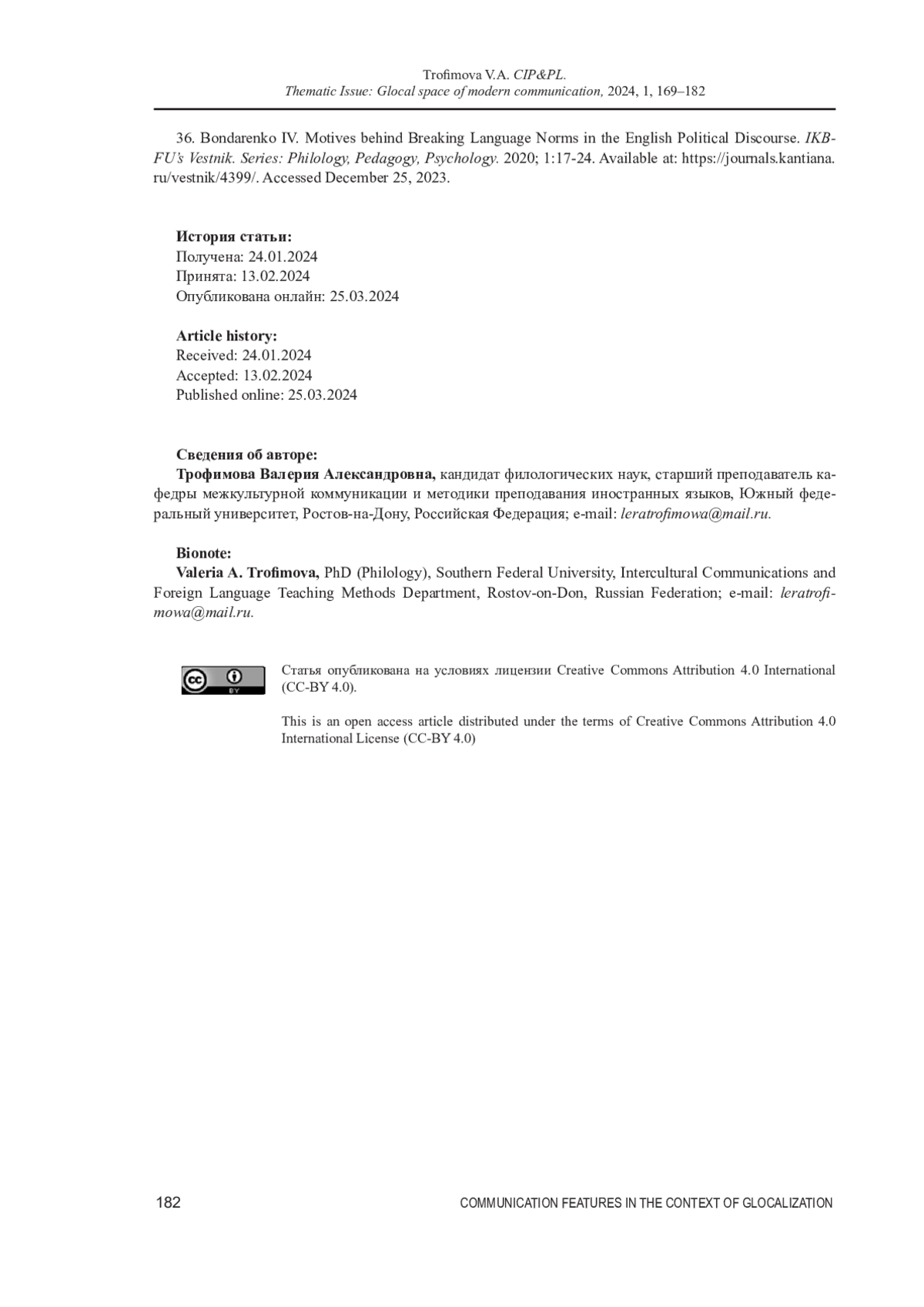 36. Бондаренко И.В. Мотивированность нарушений языковой нормы в английском политическом дискурсе. Вестник Балтийского федерального университета им. И. Канта. Серия: Филология, педагогика, психология. 2020;1:17-24. Доступно по: https://journals.kantiana.ru/vestnik/4399/. Ссылка активна на 25.12.2023. EDN: HQMODB