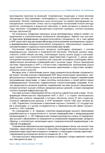 етоды обучения [3]. На успешность внедрения описанных выше инновационных средств влияют поведенческие и психологические особенности обучающихся. Именно они выступают фактором формирования конкурентоспособного специалиста. Но в тоже время в КНР существует ряд противоречий между использованием инновационных средств и формированием конкурентоспособного специалиста, обусловленные социальноэкономическими и социально-психологическими факторами. Построение образовательного процесса необходимо проводить с учетом индивидуальных запросов и возможностей обучения. Обучение должно представлять собой гибкую систему, отвечающую спросу рынка труда и учитывающую социальные и психологические характеристики студентов. С целью удовлетворения меняющихся потребностей отраслей экономики необходимо иметь эффективные механизмы взаимодействия с рынком труда. Только приведение системы образования в КНР в соответствие современным требованиям рынка труда может способствовать качественным изменениям в подготовке профессионалов своего дела [4].