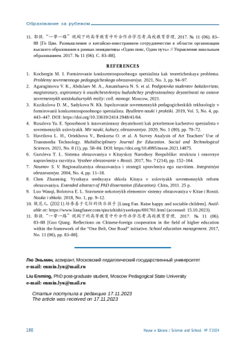11. 郭强.“一带一路”视阈下的高等教育中外合作办学思考.高校教育管理, 2017. № 11 (06). 83-88 [Го Цян. Размышления о китайско-иностранном сотрудничестве в области организации высшего образования в рамках инициативы “Один пояс, Один путь” // Управление школьным образованием. 2017. № 11 (06). C. 83-88].