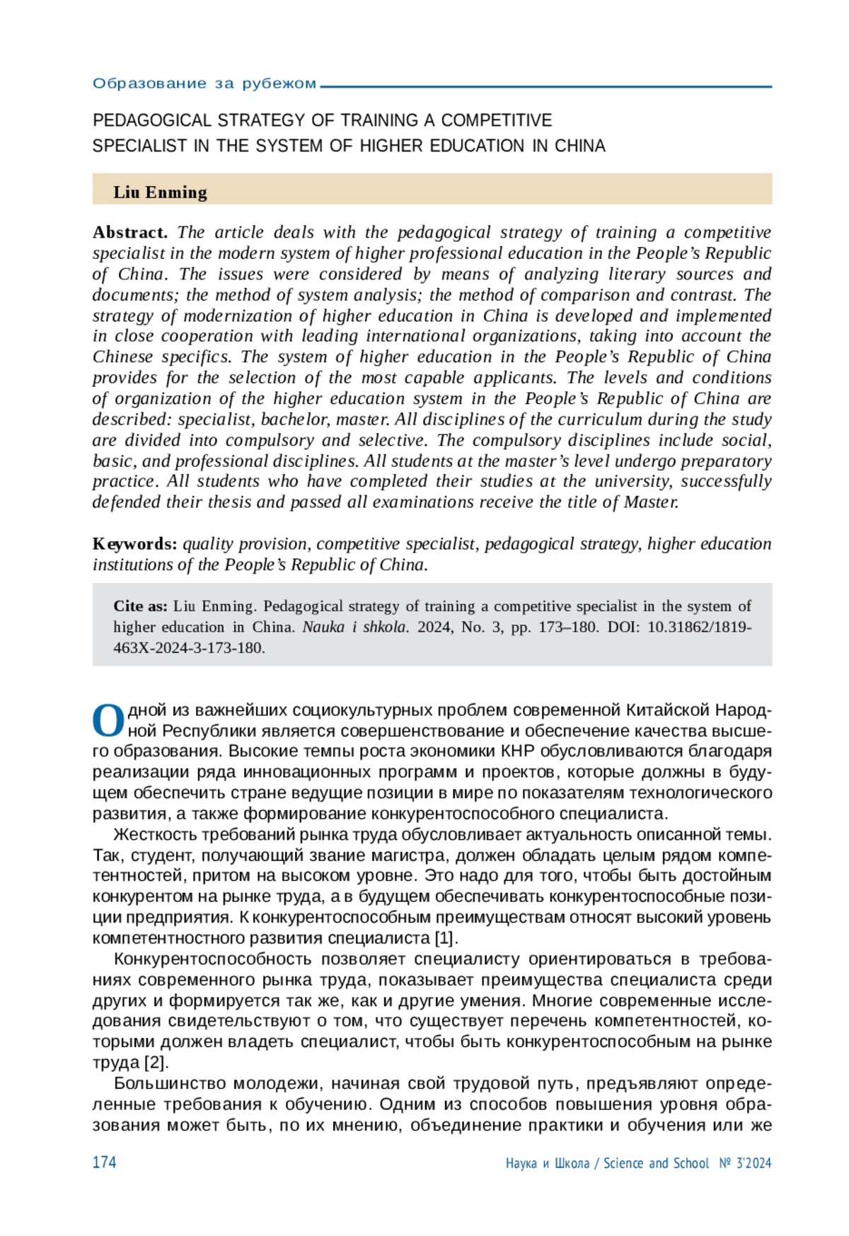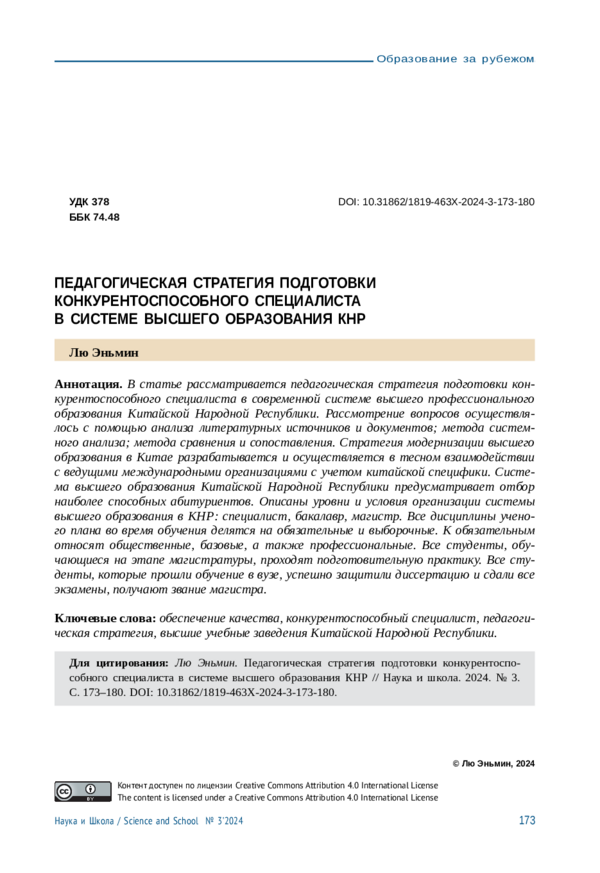 В статье рассматривается педагогическая стратегия подготовки конкурентоспособного специалиста в современной системе высшего профессионального образования Китайской Народной Республики. Рассмотрение вопросов осуществлялось с помощью анализа литературных источников и документов; метода системного анализа; метода сравнения и сопоставления. Стратегия модернизации высшего образования в Китае разрабатывается и осуществляется в тесном взаимодействии с ведущими международными организациями с учетом китайской специфики. Система высшего образования Китайской Народной Республики предусматривает отбор наиболее способных абитуриентов. Описаны уровни и условия организации системы высшего образования в КНР: специалист, бакалавр, магистр. Все дисциплины ученого плана во время обучения делятся на обязательные и выборочные. К обязательным относят общественные, базовые, а также профессиональные. Все студенты, обучающиеся на этапе магистратуры, проходят подготовительную практику. Все студенты, которые прошли обучение в вузе, успешно защитили диссертацию и сдали все экзамены, получают звание магистра.