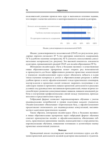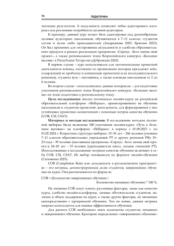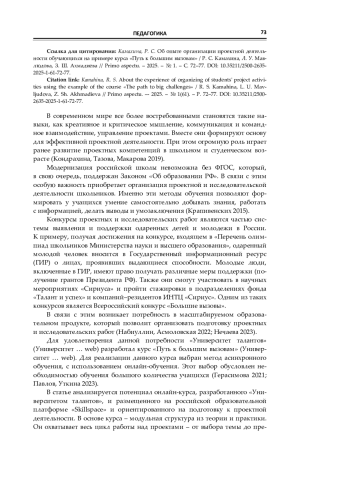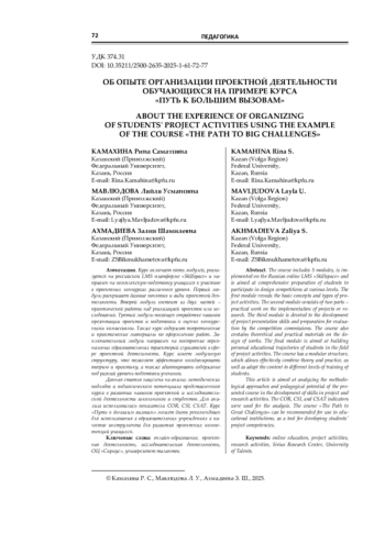 Данная статья нацелена на анализ методических подходов и педагогического потенциала представленного курса в развитии навыков проектной и исследовательской деятельности школьников и студентов. Для анализа использовались показатели COR, CSI, CSAT. Курс «Путь к большим вызовам» может быть рекомендован для использования в образовательных учреждениях в качестве инструмента для развития проектных компетенций учащихся.