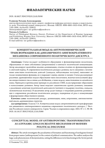 Статья исследует особенности образования и функционирования неологизмов, образованных от имен собственных (антропонимов) в контексте политической коммуникации. Автор анализирует масштабное явление деонимизации, отмечая отличия его функционирования в советский период. В современном политическом дискурсе деонимы, часто связанные с негативными качествами политических деятелей (скандалы, неблаговидные поступки), выполняют не только номинативную функцию, но и выражают оценку, мнение и эмоции. Статья рассматривает различные деривационные модели образования таких неологизмов, включая использование формы множественного числа онима для обобщения, а также модели, заимствованные из английского языка. Приводятся оригинальные примеры из российских СМИ, иллюстрирующие образование и использование деонимов. Автор также выделяет семантические группы деонимов, связанные с различными аспектами политической деятельности (митинги в поддержку политика, скандалы, экономическая политика). В заключение автор делает выводы о тенденциях развития деонимизации в современном российском политическом дискурсе, подчеркивая её роль в коммуникации и формировании общественного мнения.
