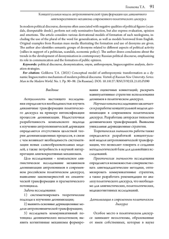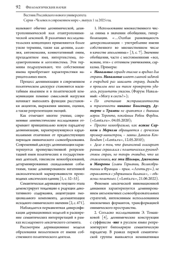 Актуальность настоящего исследования определяется необходимостью изучить динамичные трансформации политического дискурса на примере интенсификации процессов деонимизации.