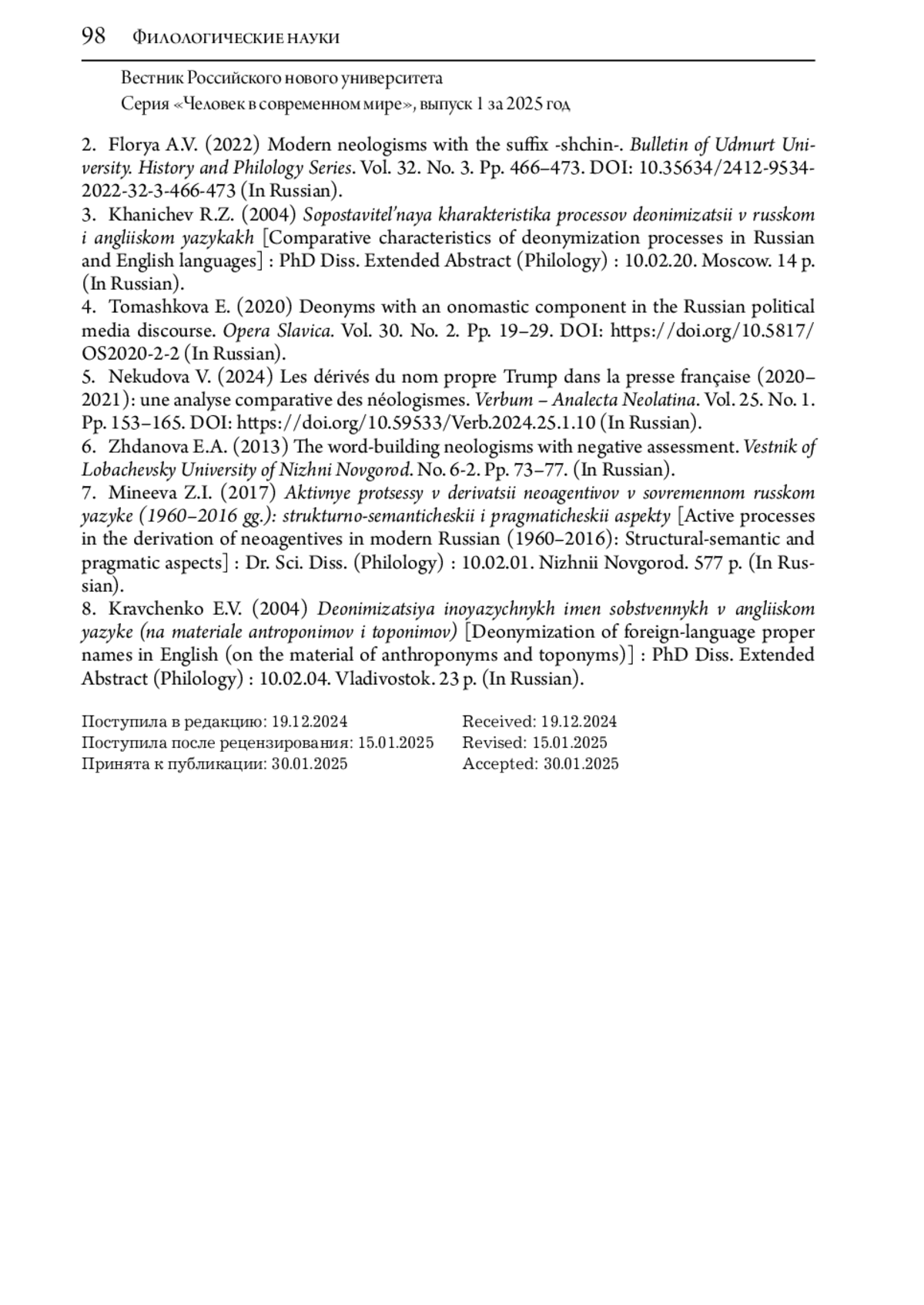 5. Nekudova V. Les dérivés du nom propre Trump dans la presse française (2020–2021): une analyse comparative des néologismes // Verbum – Analecta Neolatina. 2024. Vol. 25. No. 1. P. 153–165. DOI: htt ps://doi.org/10.59533/Verb.2024.25.1.10