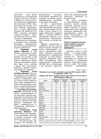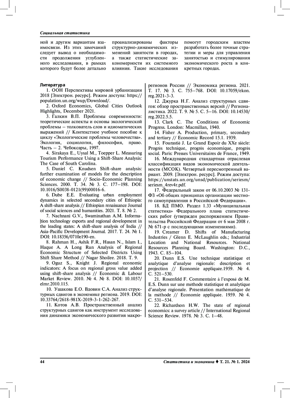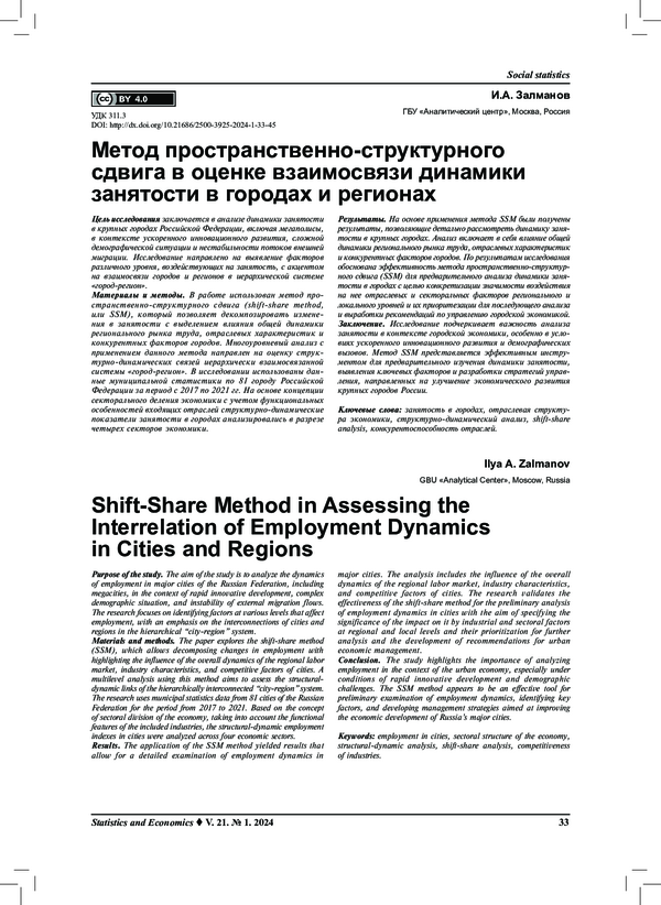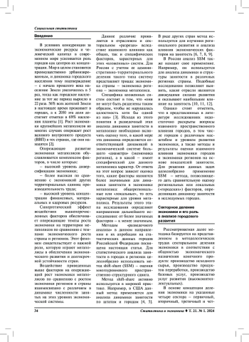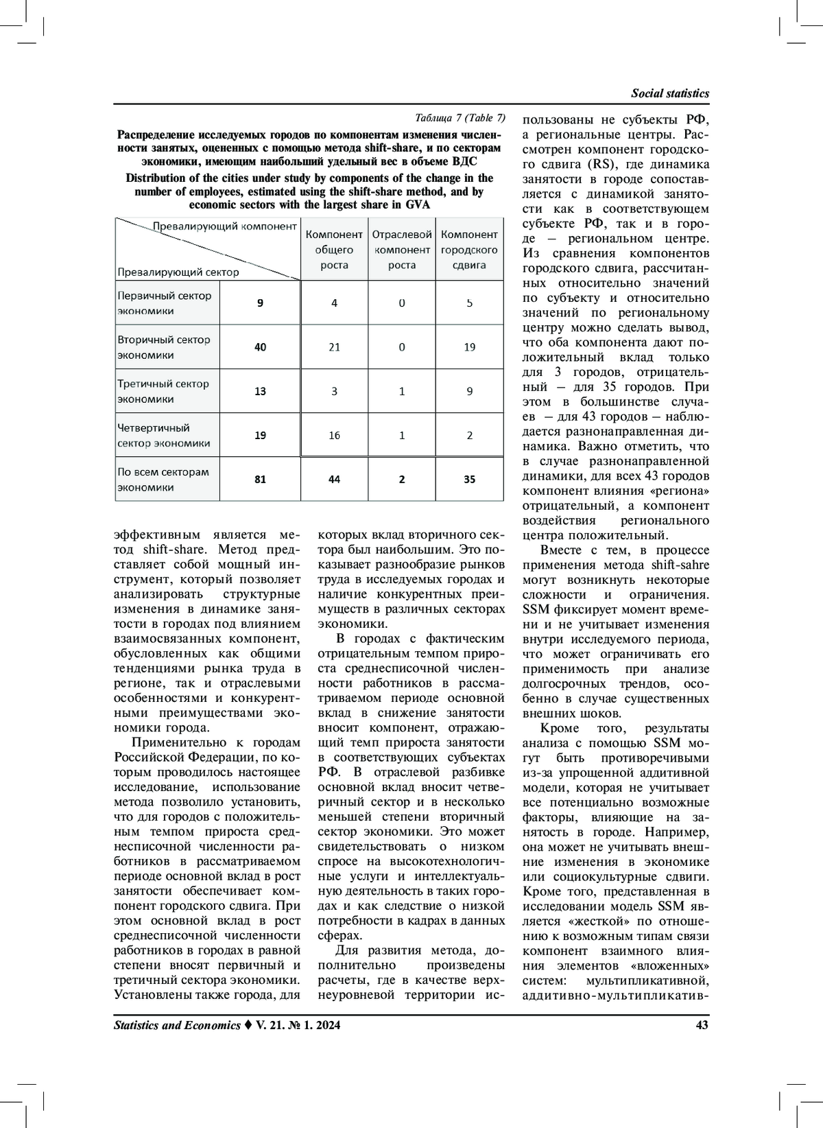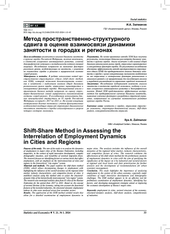 Материалы и методы. В работе использован метод пространственно-структурного сдвига (shift-share method, или SSM), который позволяет декомпозировать изменения в занятости с выделением влияния общей динамики регионального рынка труда, отраслевых характеристик и конкурентных факторов городов. Многоуровневый анализ с применением данного метода направлен на оценку структурно-динамических связей иерархически взаимосвязанной системы «город-регион». В исследовании использованы данные муниципальной статистики по 81 городу Российской Федерации за период с 2017 по 2021 гг. На основе концепции секторального деления экономики с учетом функциональных особенностей входящих отраслей структурно-динамические показатели занятости в городах анализировались в разрезе четырех секторов экономики.