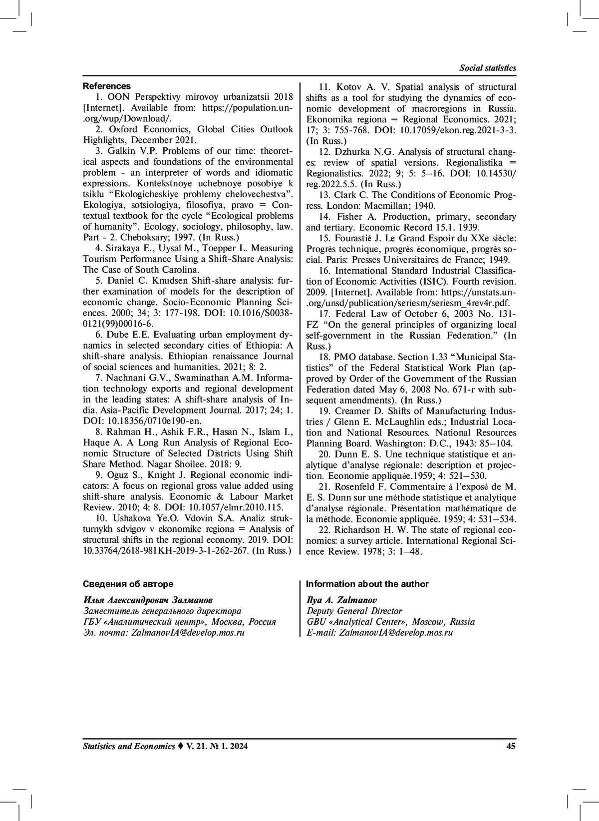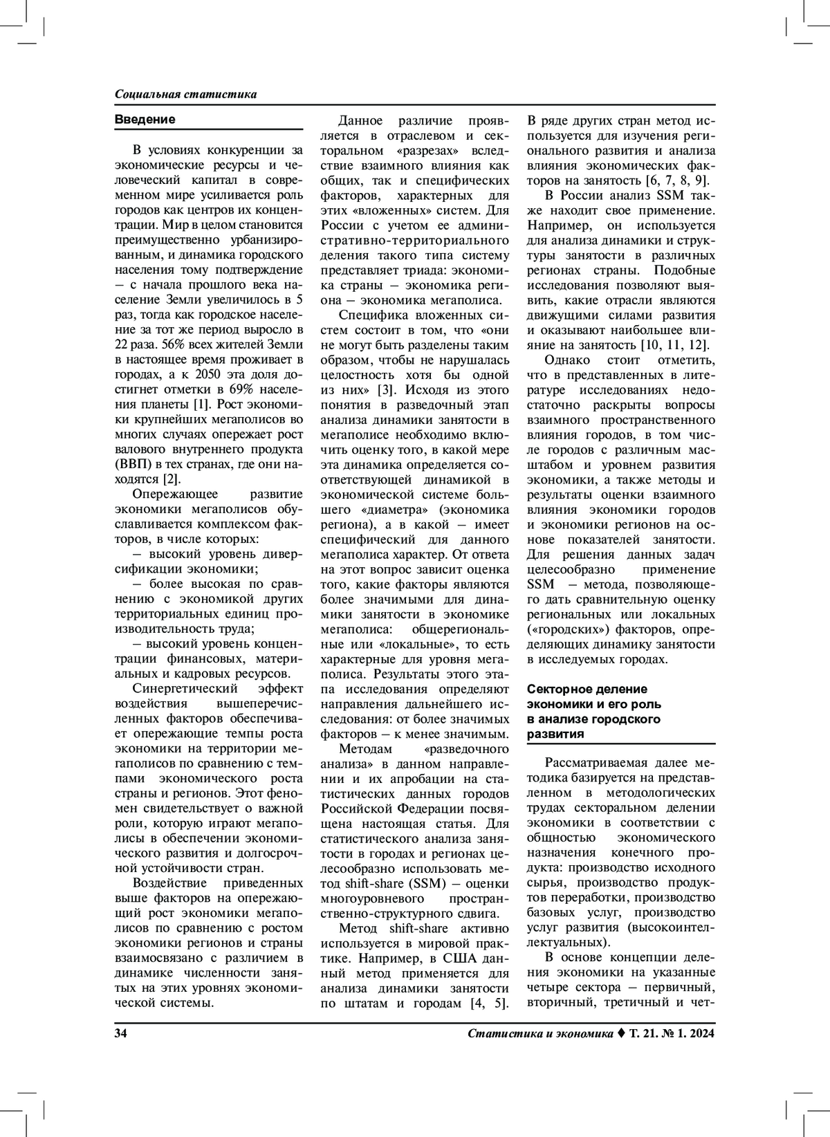 Заключение. Исследование подчеркивает важность анализа занятости в контексте городской экономики, особенно в условиях ускоренного инновационного развития и демографических вызовов. Метод SSM представляется эффективным инструментом для предварительного изучения динамики занятости, выявления ключевых факторов и разработки стратегий управления, направленных на улучшение экономического развития крупных городов России.