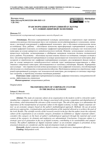 Статья: ТРАНСФОРМАЦИЯ КОРПОРАТИВНОЙ КУЛЬТУРЫ В УСЛОВИЯХ ЦИФРОВОЙ ЭКОНОМИКИ (2025)