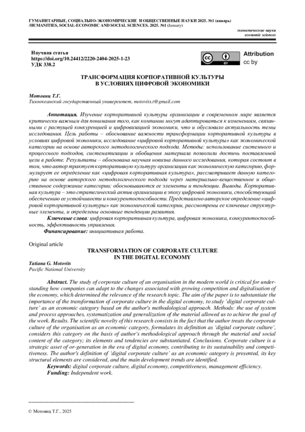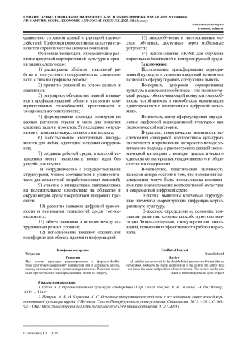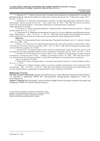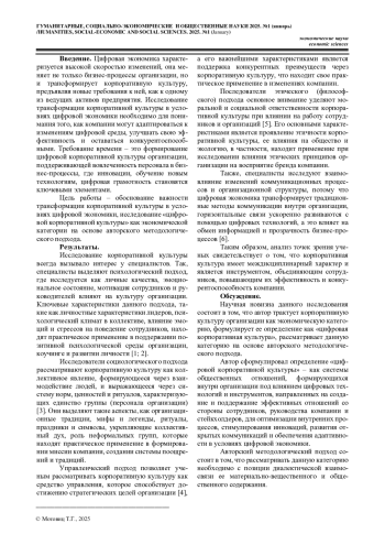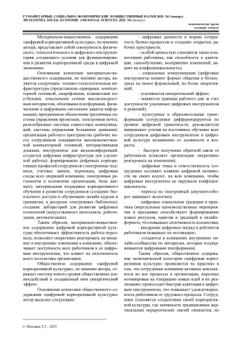 МОТОВИЦ Т. Г. ТРАНСФОРМАЦИЯ КОРПОРАТИВНОЙ КУЛЬТУРЫ В УСЛОВИЯХ ЦИФРОВОЙ ЭКОНОМИКИ // ГУМАНИТАРНЫЕ, СОЦИАЛЬНО-ЭКОНОМИЧЕСКИЕ И ОБЩЕСТВЕННЫЕ НАУКИ. 2025. №1