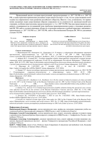 2. Андреев В.Л., Соловьев В.С. Уголовно-правовая охрана общественных отношений в период распространения новой коронавирусной инфекции (Covid-19) на территории Российской Федерации // Общество и право. 2020. № 2 (72). URL: https://cyberleninka.ru/article/n/ugolovno-pravovaya-ohrana-obschestvennyh-otnosheniyv-period-rasprostraneniya-novoy-koronavirusnoy-infektsii-covid-19-na-territorii (дата обращения: 24.07.2024).