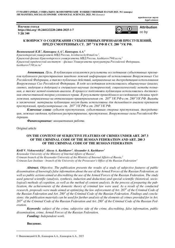 преступлений, предусмотренных ст. 207 3 УК РФ и ст. 280 3 УК РФ // URL: https://onlinescience.ru/userfiles/file/vishneveckij_kashkarov_kashkarov_2024_12_waw9o34vvq.pdf (дата обращения: 24.12.2024).