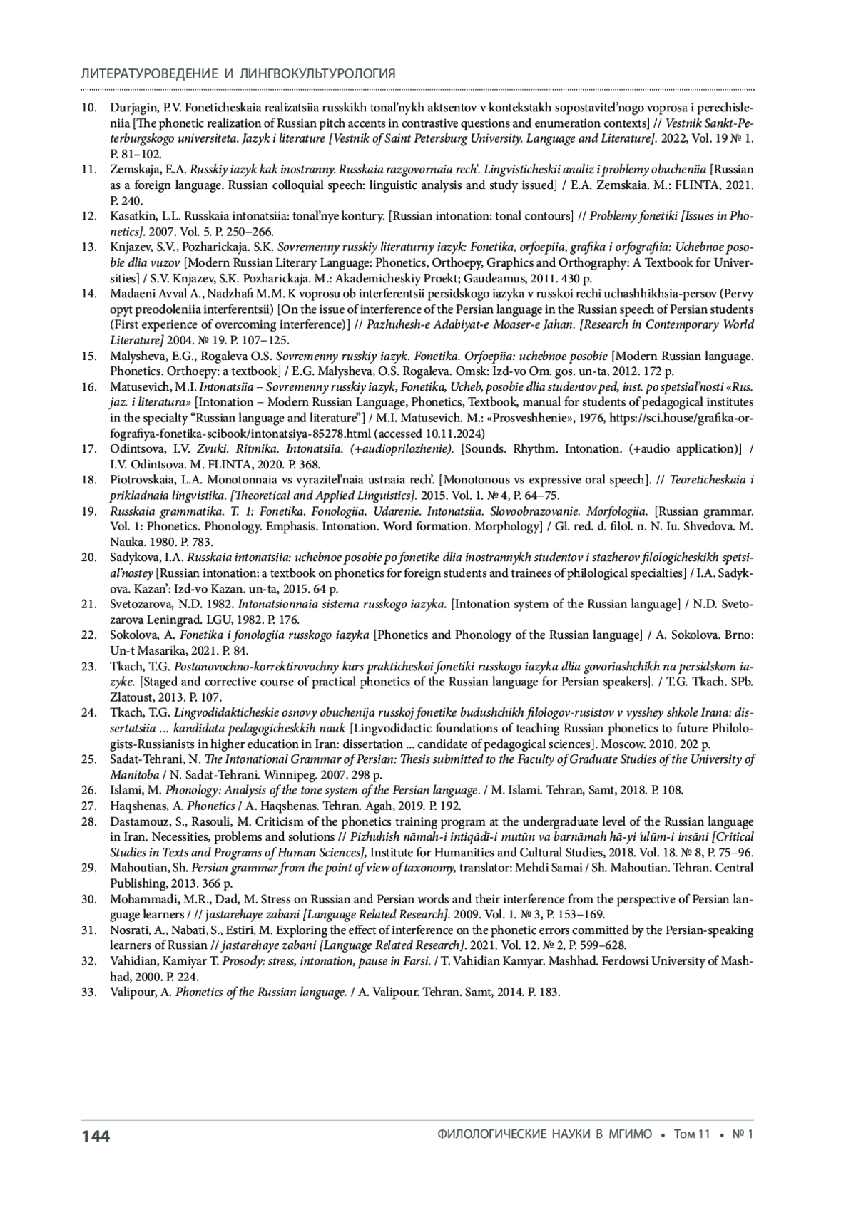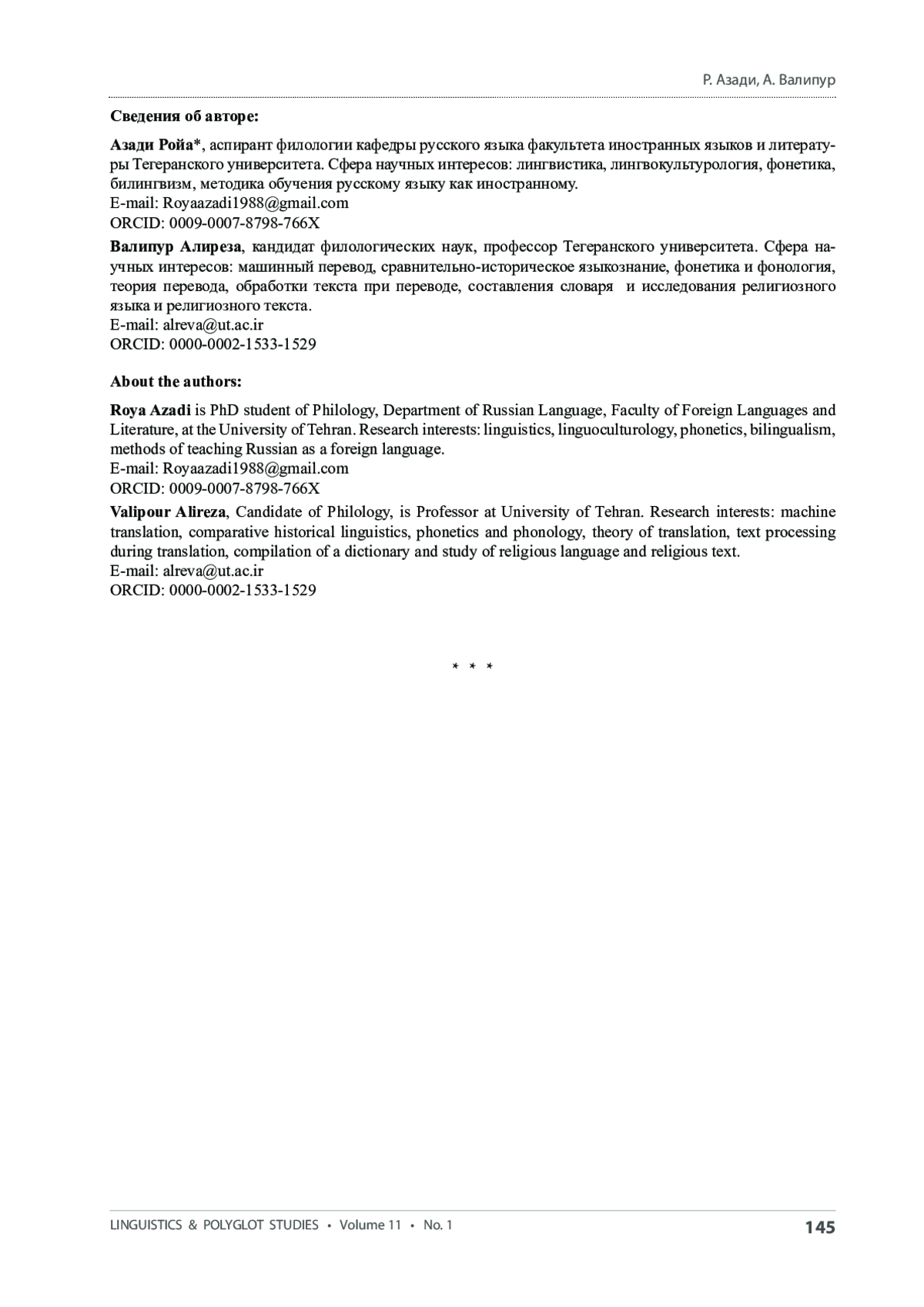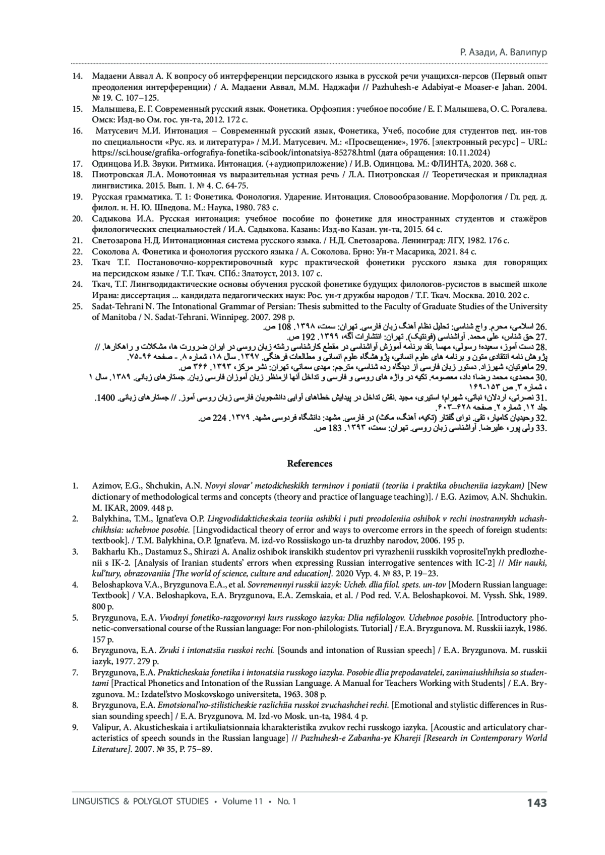 При изучении нового языка учащиеся могут столкнуться с различными трудностями, связанными, в частности, с уникальными структурными аспектами целевого языка. Одним из фундаментальных и важнейших предметов в области языкового образования является фонетика - один из основных разделов языкознания, который позволяет сосредоточить внимание языка на физических аспектах и координатах звуков речи. Фонетика - это область языкознания, которая рассматривает интонацию как средство регистрации высказываний и создания их целостности, одновременно разделяя речевые потоки на минимальные единицы, имеющие семантическое значение. В данной статье путём сравнительного анализа суперсегментных единиц русского и персидского языков исследуются просодические различия сравниваемых языков по направлению движения тонов, что приводит к объяснению факторов неправильного произнесения у иранских студентов в реализации шестой интонационной конструкции. В связи с этим, цель исследования заключается в определении конфликтующего характера интонационных систем предложений в русском и персидском языках в соответствии с целью высказывания в рамках физического (акустического) анализа речевого потока, в выявлении факторов искажения шестой интонационной конструкции (ИК-6) у иранских студентов и их исправлении. Исследование предназначено для иранских студентов, которые обладают фундаментальным пониманием фонетической структуры и основных параметров русских звуков, ритмики и интонации. Наше исследование направлено на развитие произносительных навыков с одновременным совершенствованием устной речи. Понимание интонации стало ключевым элементом нашего исследовательского подхода. В результате анализа акустических сигналов, включая форму волны, высоту тона и интенсивность, полученных из шестой интонационной конструкции, произносимой иранскими студентами, было обнаружено, что на их речевую ориентацию влияет фонетическая структура персидского языка. Эта ориентация отличается от того, как фонетические параметры используются в русском языке. Более того, было продемонстрировано, что повествовательные предложения в обоих языках отличаются по высоте тона в своей нейтральной реализации. Это различие объясняется выявлением интонационного центра высказываний и определением положения ударения в каждой мелодической фразе.