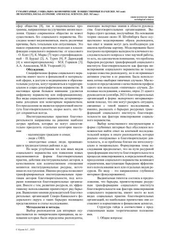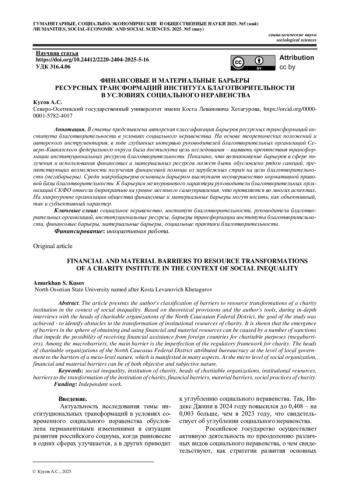 В статье представлена авторская классификация барьеров ресурсных трансформаций института благотворительности в условиях социального неравенства. На основе теоретических положений и авторского инструментария, в ходе глубинных интервью руководителей благотворительных организаций Северо-Кавказского федерального округа была достигнута цель исследования – выявить препятствия трансформации институциональных ресурсов благотворительности. Показано, что возникновение барьеров в сфере получения и использования финансовых и материальных ресурсов может быть обусловлено рядом санкций, препятствующих возможности получения финансовой помощи из зарубежных стран на цели благотворительности (мегабарьеры). Среди макробарьеров основным барьером выступает несовершенство нормативной правовой базы благотворительности. К барьерам мезоуровневого характера руководители благотворительных организаций СКФО отнесли бюрократию на уровне местного самоуправления, что проявляется во многих аспектах. На микроуровне организации общества финансовые и материальные барьеры могут носить, как объективный, так и субъективный характер.