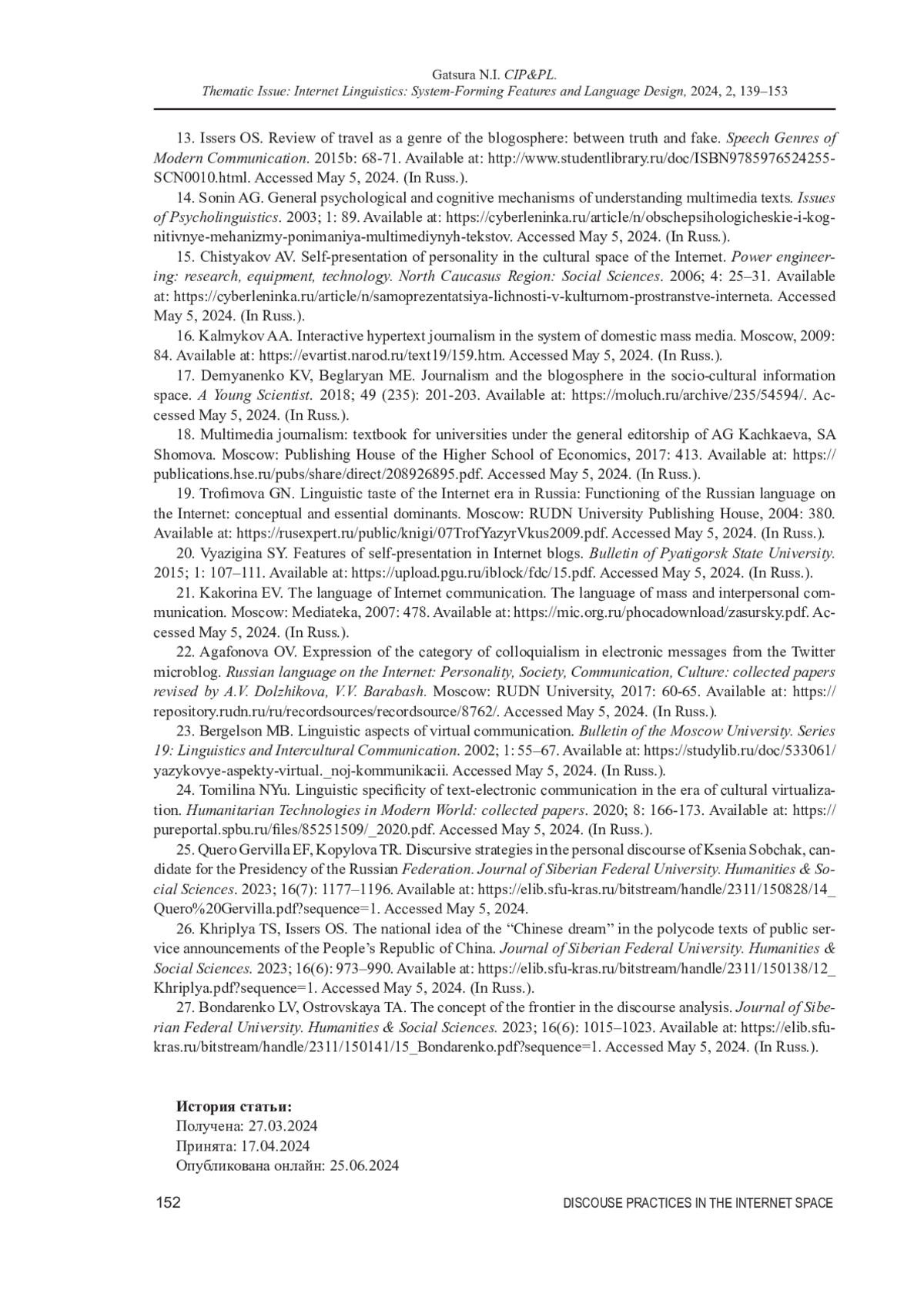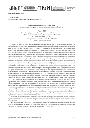 Ключевые фразы: трэвел-блог, жанровые особенности, СТРУКТУРНЫЕ ОСОБЕННОСТИ, анализ дискурса, прагмастилистические особенности, ИНТЕРНЕТ-КОММУНИКАЦИЯ, разговорная речь, экспрессивно-оценочные средства