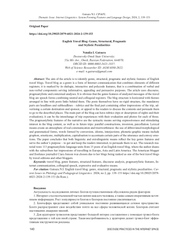 Статья: АНГЛОЯЗЫЧНЫЙ АВТОРСКИЙ ТРЭВЕЛ-БЛОГ: ЖАНРОВЫЕ, СТРУКТУРНЫЕ И ПРАГМАСТИЛИСТИЧЕСКИЕ ОСОБЕННОСТИ (2024)