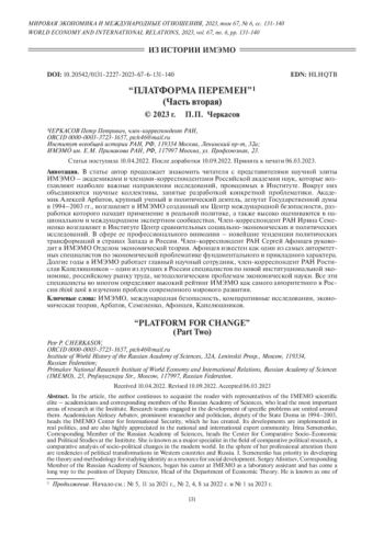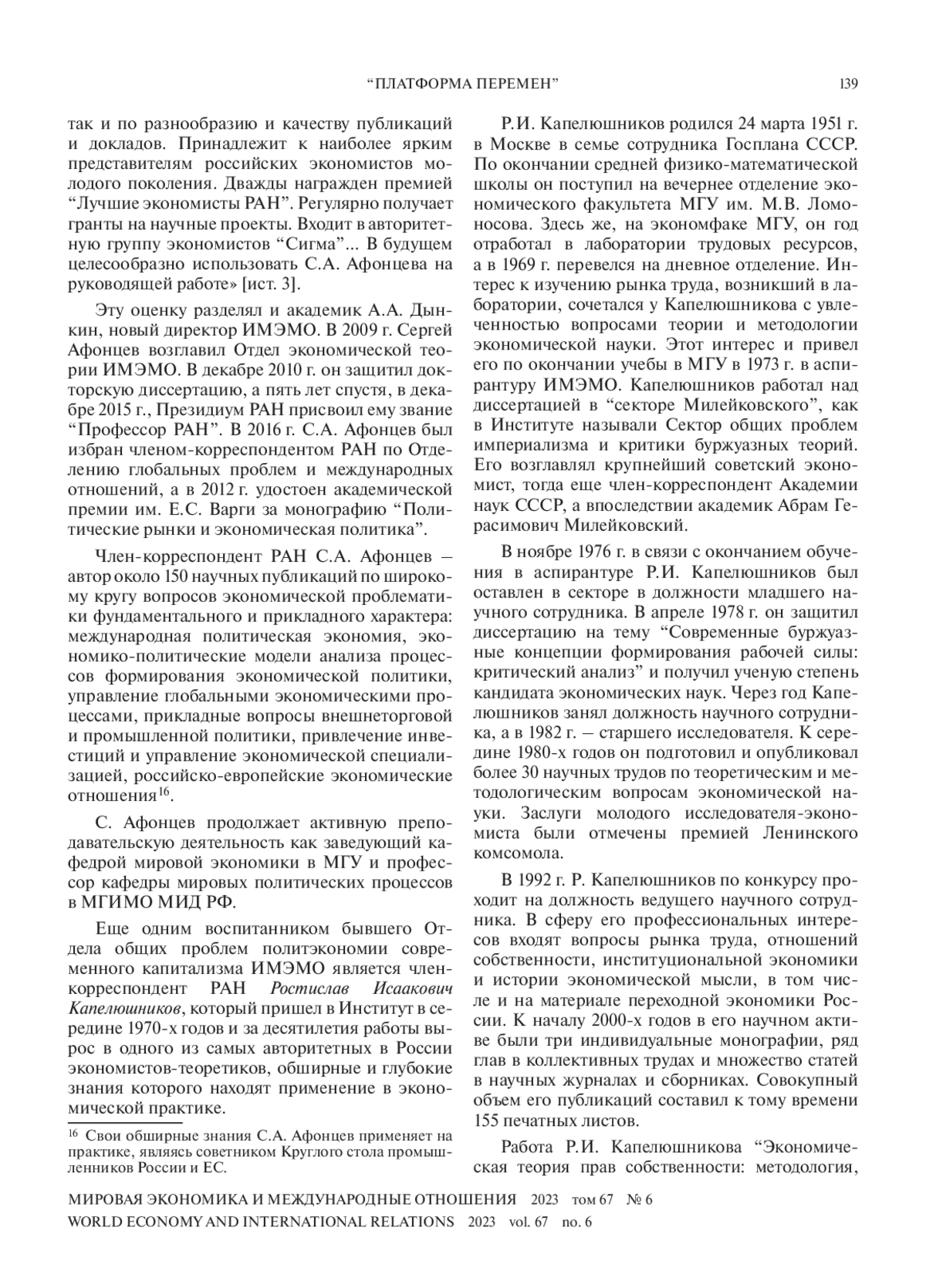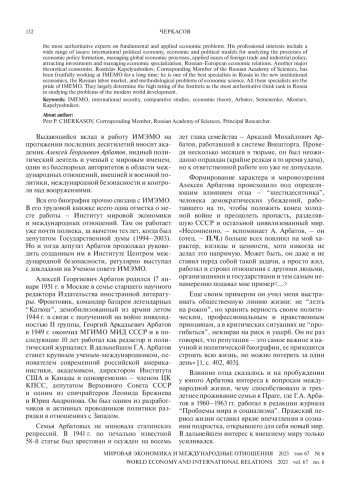 В статье автор продолжает знакомить читателя с представителями научной элиты ИМЭМО - академиками и членами-корреспондентами Российской академии наук, которые возглавляют наиболее важные направления исследований, проводимых в Институте. Вокруг них объединяются научные коллективы, занятые разработкой конкретной проблематики. Академик Алексей Арбатов, крупный ученый и политический деятель, депутат Государственной думы в 1994-2003 гг. возглавляет в ИМЭМО созданный им Центр международной безопасности, разработки которого находят применение в реальной политике, а также высоко оцениваются в национальном и международном экспертном сообществах. Член-корреспондент РАН Ирина Семененко возглавляет в Институте Центр сравнительных социально-экономических и политических исследований. В сфере ее профессионального внимания - новейшие тенденции политических трансформаций в странах Запада и России. Член-корреспондент РАН Сергей Афонцев руководит в ИМЭМО Отделом экономической теории. Афонцев известен как один из самых авторитетных специалистов по экономической проблематике фундаментального и прикладного характера. Долгие годы в ИМЭМО работает главный научный сотрудник, член-корреспондент РАН Ростислав Капелюшников - один из лучших в России специалистов по новой институциональной экономике, российскому рынку труда, методологическим проблемам экономической науки. Все эти специалисты во многом определяют высокий рейтинг ИМЭМО как самого авторитетного в России thinktank в изучении проблем современного мирового развития.