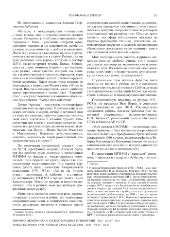 Выдающийся вклад в работу ИМЭМО на протяжении последних десятилетий вносит академик Алексей Георгиевич Арбатов, видный политический деятель и ученый с мировым именем, один из бесспорных авторитетов в области международных отношений, внешней и военной политики, международной безопасности и контроля над вооружениями.