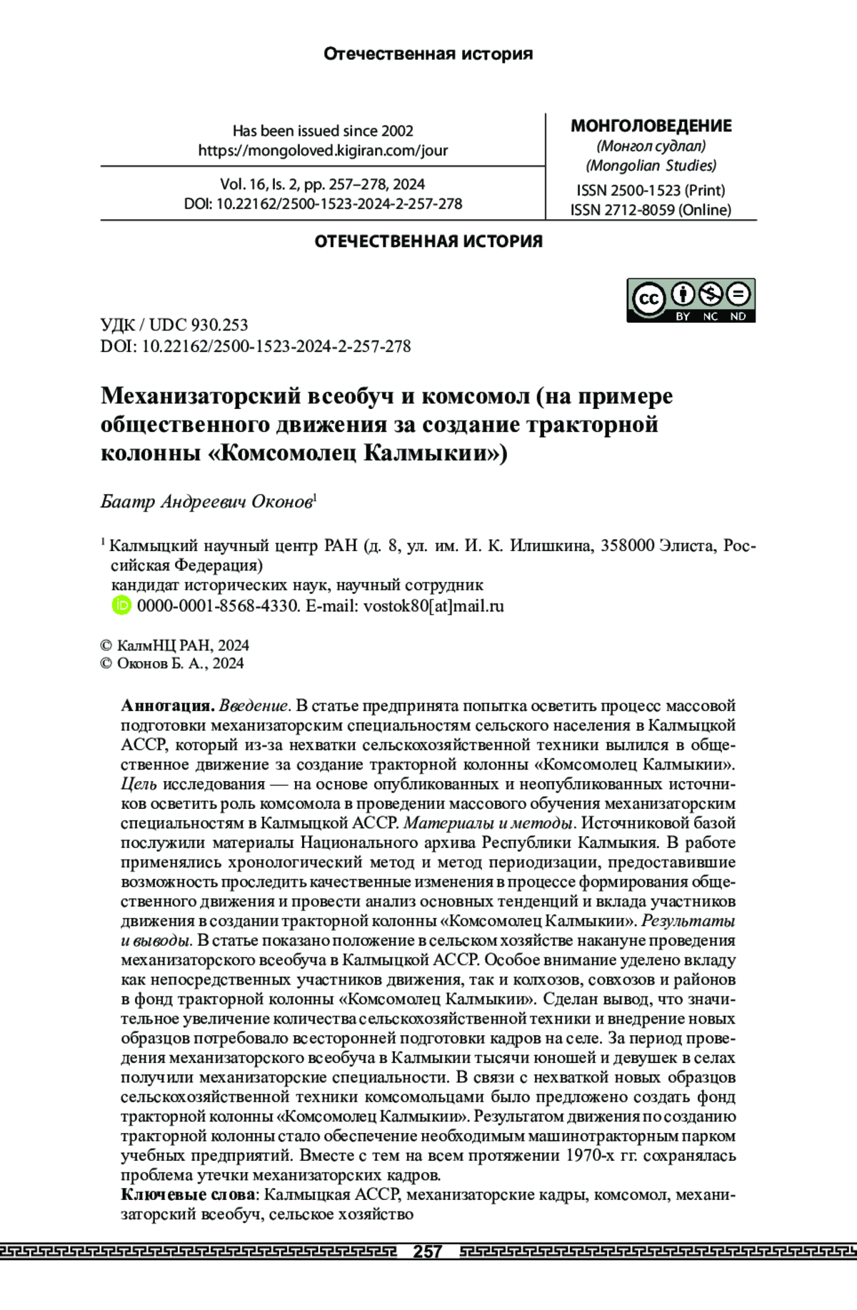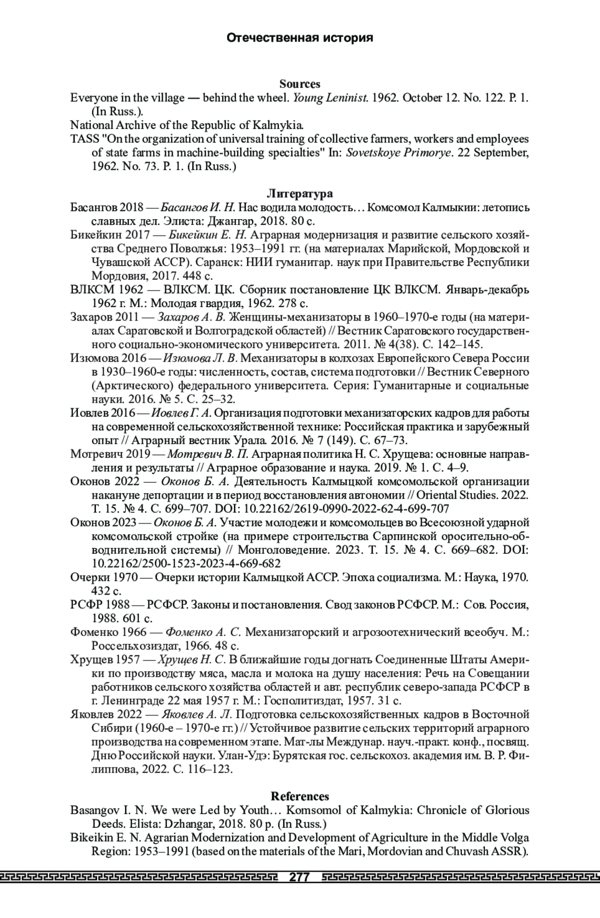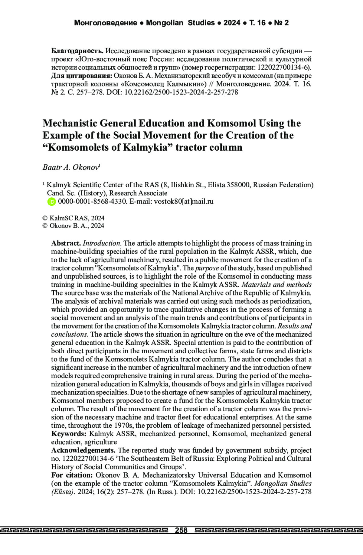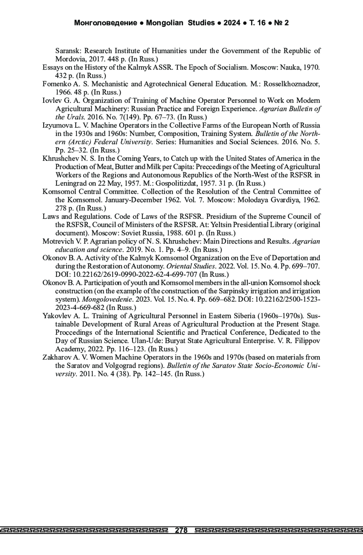 11. Оконов 2022 - Оконов Б. А. Деятельность Калмыцкой комсомольской организации накануне депортации и в период восстановления автономии // Oriental Studies. 2022. Т. 15. № 4. С. 699-707. https://doi.org/10.22162/2619-0990-2022-62-4-699-707