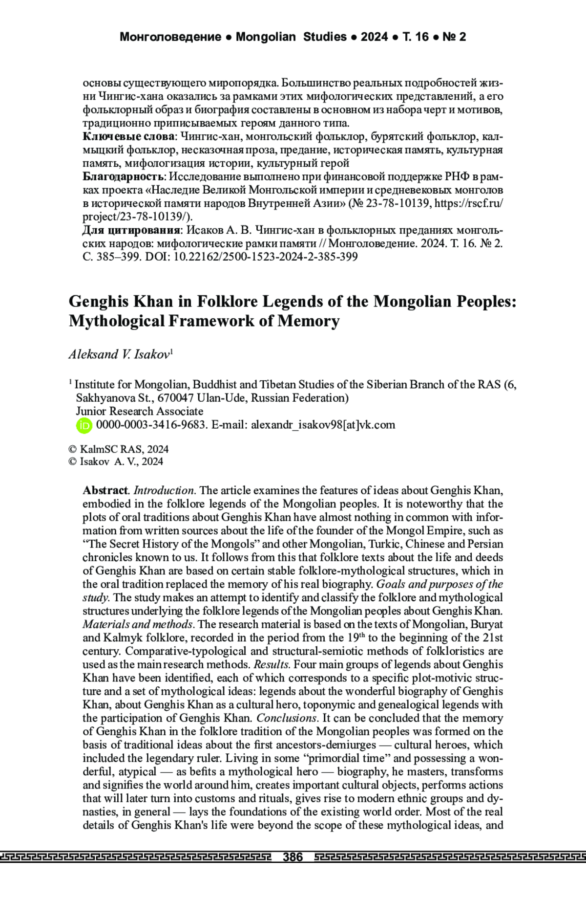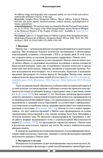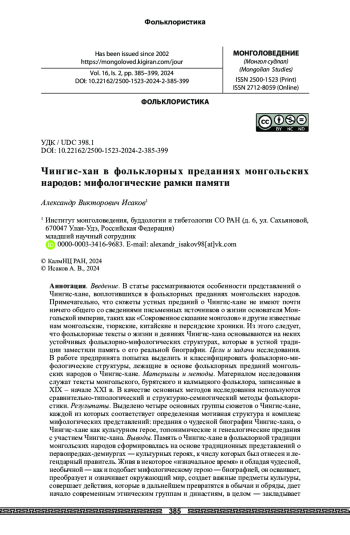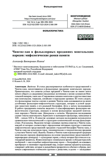 Введение. В статье рассматриваются особенности представлений о Чингис-хане, воплотившихся в фольклорных преданиях монгольских народов. Примечательно, что сюжеты устных преданий о Чингис-хане не имеют почти ничего общего со сведениями письменных источников о жизни основателя Монгольской империи, таких как «Сокровенное сказание монголов» и другие известные нам монгольские, тюркские, китайские и персидские хроники. Из этого следует, что фольклорные тексты о жизни и деяниях Чингис-хана основываются на неких устойчивых фольклорно-мифологических структурах, которые в устной традиции заместили память о его реальной биографии. Цели и задачи исследования. В работе предпринята попытка выделить и классифицировать фольклорно-мифологические структуры, лежащие в основе фольклорных преданий монгольских народов о Чингис-хане. Материалы и методы. Материалом исследования служат тексты монгольского, бурятского и калмыцкого фольклора, записанные в XIX – начале XXI в. В качестве основных методов исследования используются сравнительно-типологический и структурно-семиотический методы фольклористики. Результаты. Выделено четыре основных группы сюжетов о Чингис-хане, каждой из которых соответствует определенная мотивная структура и комплекс мифологических представлений: предания о чудесной биографии Чингис-хана, о Чингис-хане как культурном герое, топонимические и генеалогические предания с участием Чингис-хана. Выводы. Память о Чингис-хане в фольклорной традиции монгольских народов сформировалась на основе традиционных представлений о первопредках-демиургах ― культурных героях, к числу которых был отнесен и легендарный правитель. Живя в некоторое «изначальное время» и обладая чудесной, необычной ― как и подобает мифологическому герою ― биографией, он осваивает, преобразует и означивает окружающий мир, создает важные предметы культуры, совершает действия, которые в дальнейшем превратятся в обычаи и обряды, дает начало современным этническим группам и династиям, в целом ― закладывает основы существующего миропорядка. Большинство реальных подробностей жизни Чингис-хана оказались за рамками этих мифологических представлений, а его фольклорный образ и биография составлены в основном из набора черт и мотивов, традиционно приписываемых героям данного типа.
