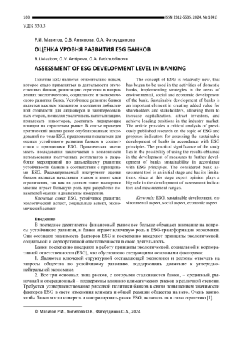 В статье приведен критический анализ ранее опубликованных исследований по теме ESG, предложены показатели для оценки устойчивого развития банков в соответствии с принципами ESG. Практическая значимость исследования заключается в возможности использования полученных результатов в разработке мероприятий по дальнейшему развитию устойчивости банков в соответствии с принципами ESG.