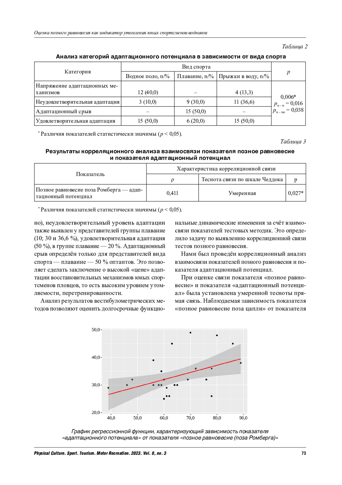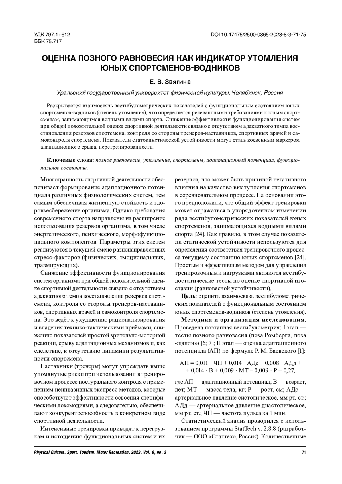 Раскрывается взаимосвязь вестибулометрических показателей с функциональным состоянием юных спортсменов-водников (степень утомления), что определяется релевантными требованиями к юным спортсменам, занимающимся водными видами спорта. Снижение эффективности функционирования систем при общей положительной оценке спортивной деятельности связано с отсутствием адекватного темпа восстановления резервов спортсмена, контроля со стороны тренеров-наставников, спортивных врачей и самоконтроля спортсмена. Показатели статокинетической устойчивости могут стать косвенным маркером адаптационного срыва, перетренированности.