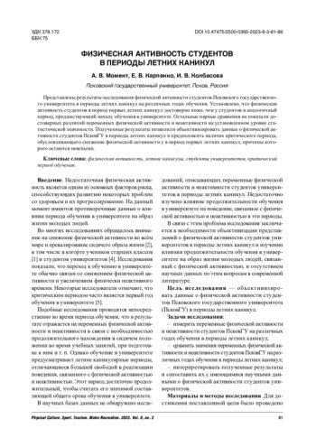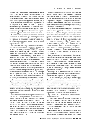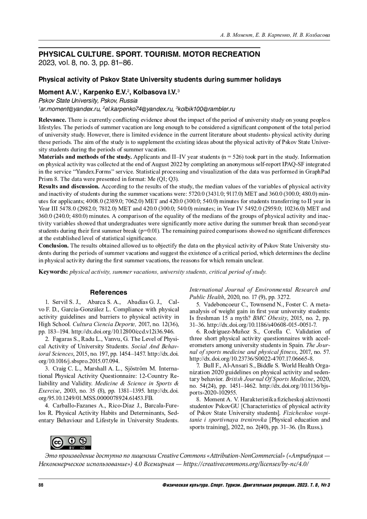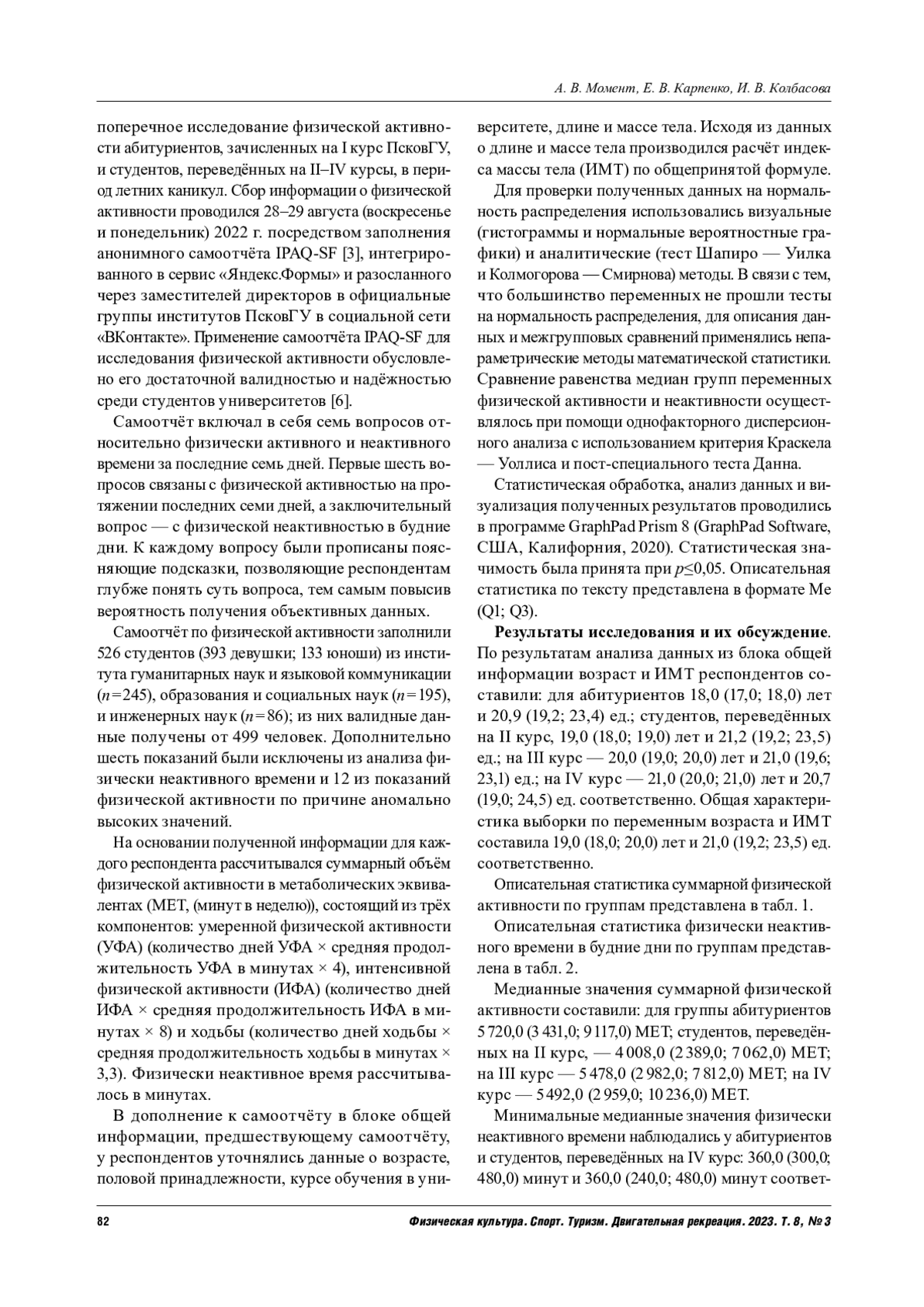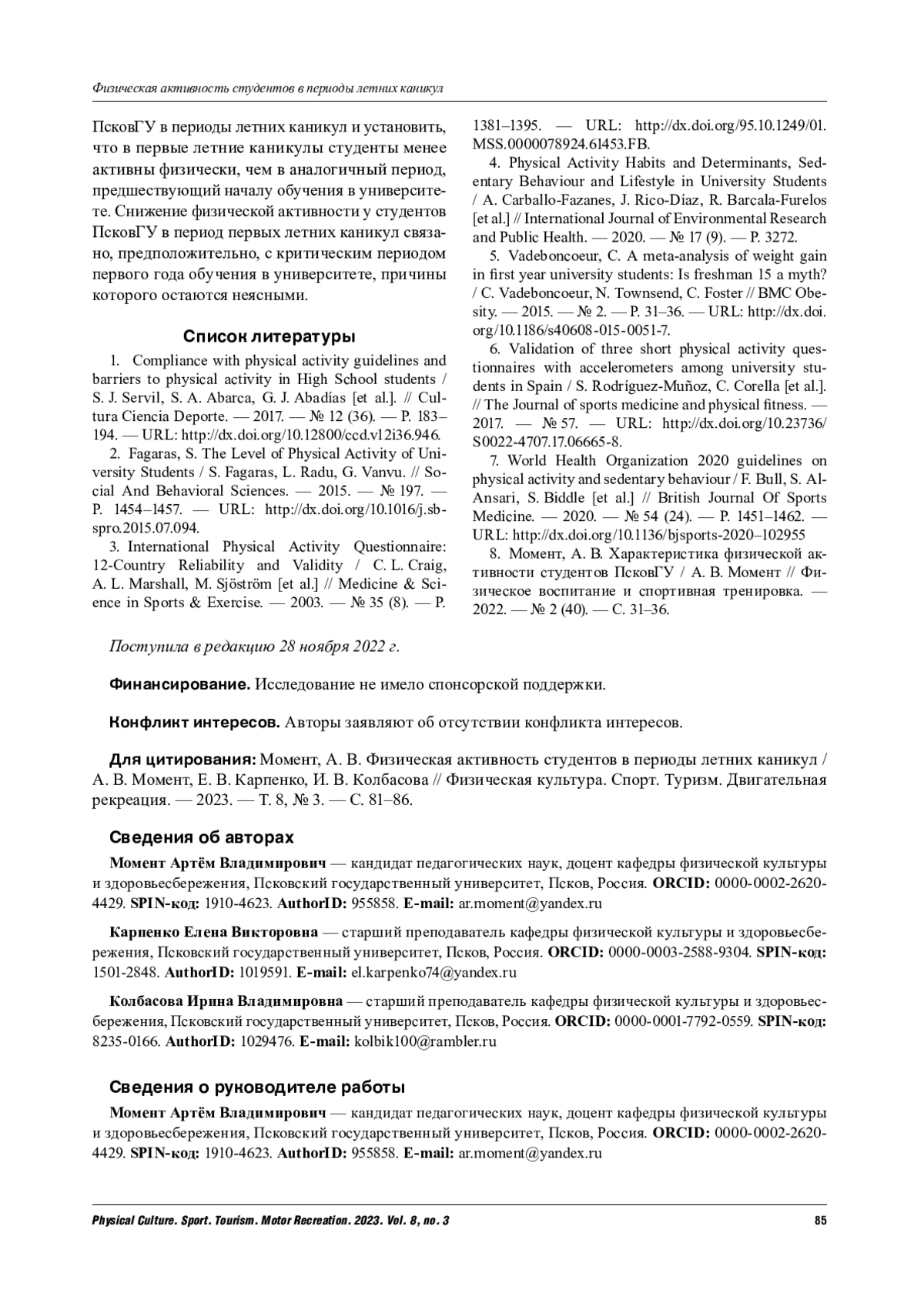 8. Момент, А. В. Характеристика физической активности студентов ПсковГУ / А. В. Момент // Физическое воспитание и спортивная тренировка. - 2022. - № 2 (40). - С. 31-36. EDN: YWEXSR