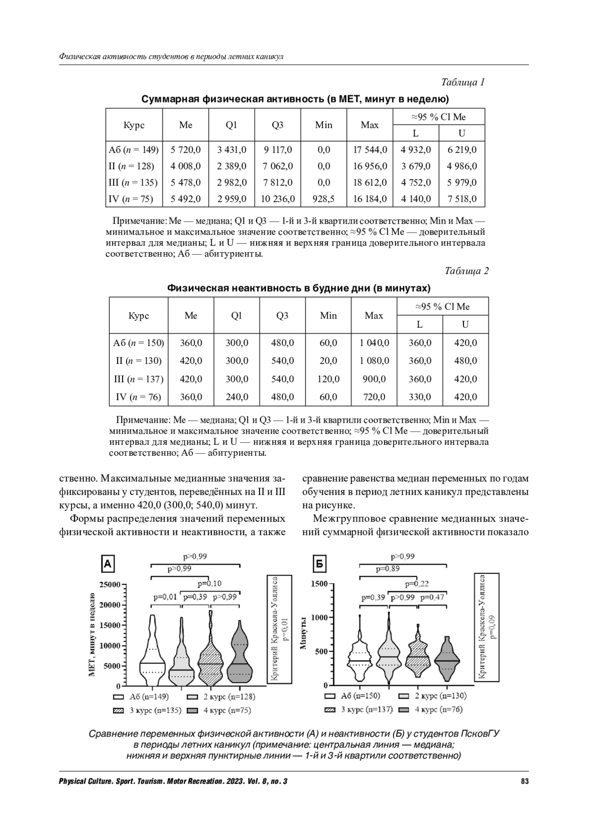 Представлены результаты исследования физической активности студентов Псковского государственного университета в периоды летних каникул на различных годах обучения. Установлено, что физическая активность студентов в период первых летних каникул достоверно ниже, чем у студентов в аналогичный период, предшествующий началу обучения в университете. Остальные парные сравнения не показали достоверных различий переменных физической активности и неактивности на установленном уровне статистической значимости. Полученные результаты позволили объективизировать данные о физической активности студентов ПсковГУ в периоды летних каникул и предположить наличие критического периода, обусловливающего снижение физической активности у в период первых летних каникул, причины которого остаются неясными.