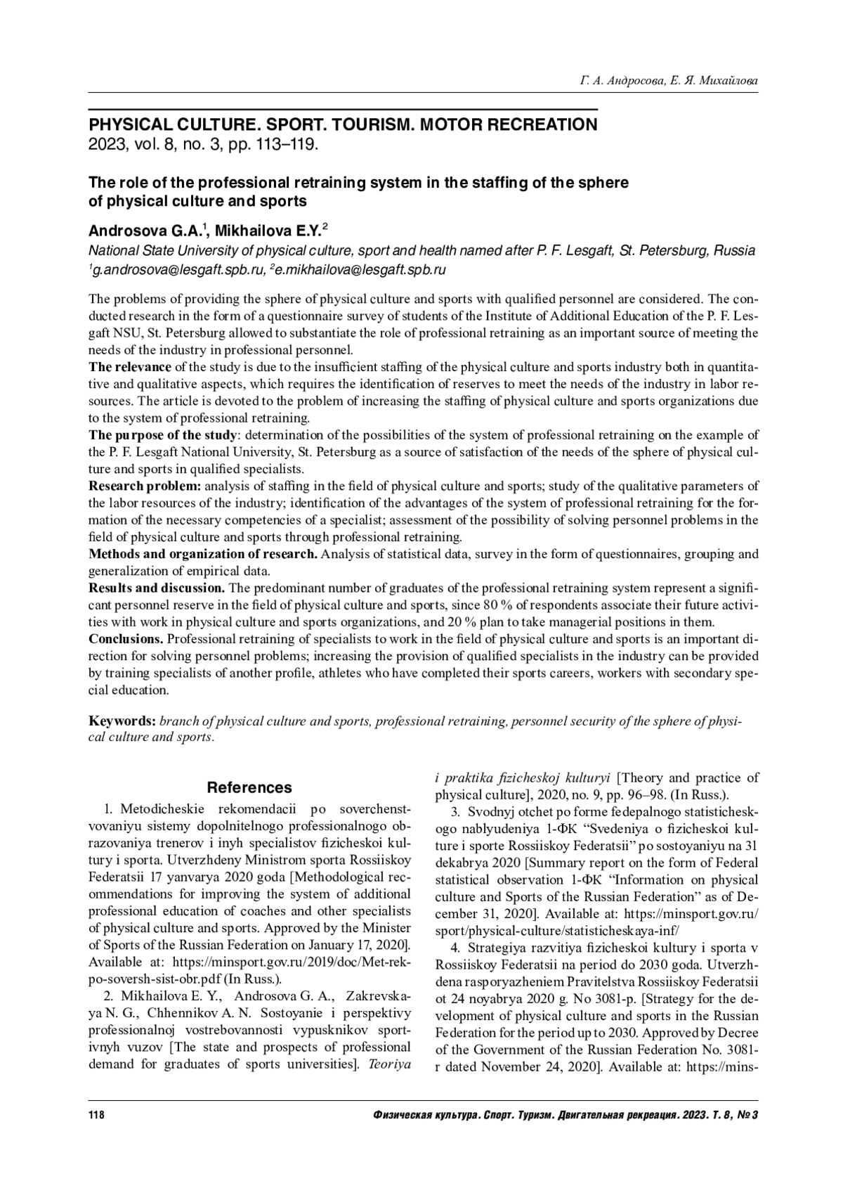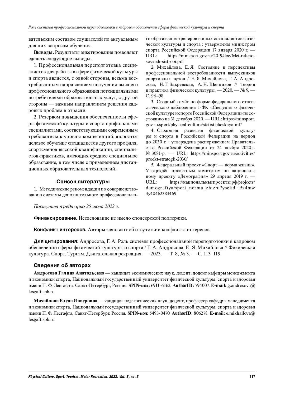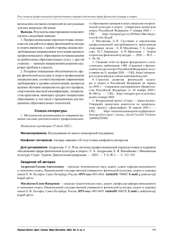 2. Михайлова, Е. Я. Состояние и перспективы профессиональной востребованности выпускников спортивных вузов / Е. Я. Михайлова, Г. А. Андросова, Н. Г. Закревская, А. H. Щенников // Теория и практика физической культуры. - 2020. - № 9. - С. 96-98. EDN: QPWFCY