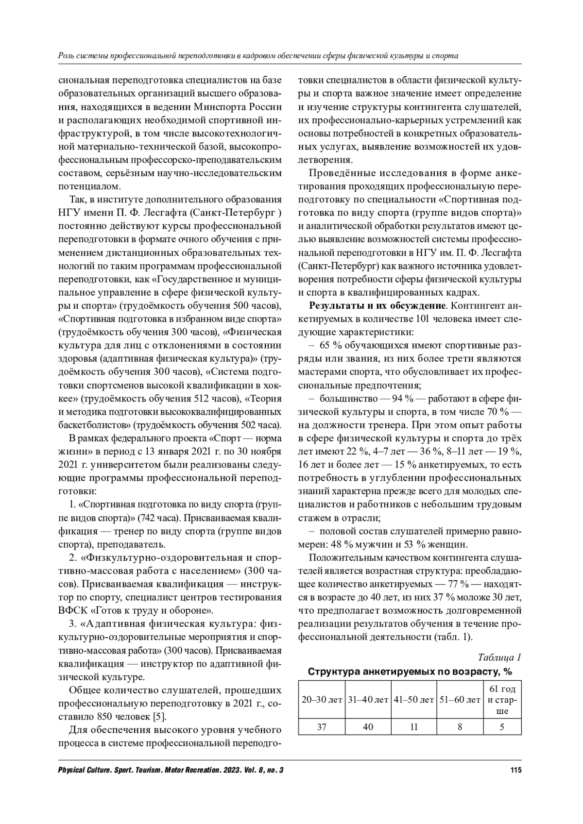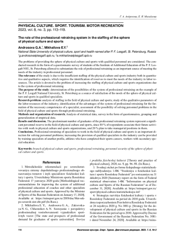 Рассматриваются проблемы обеспечения сферы физической культуры и спорта квалифицированными кадрами. Проведённые исследования в форме анкетирования слушателей Института дополнительного образования НГУ им. П. Ф. Лесгафта ( Санкт-Петербург) позволили обосновать роль профессиональной переподготовки как важного источника удовлетворения потребности отрасли в профессиональных кадрах.