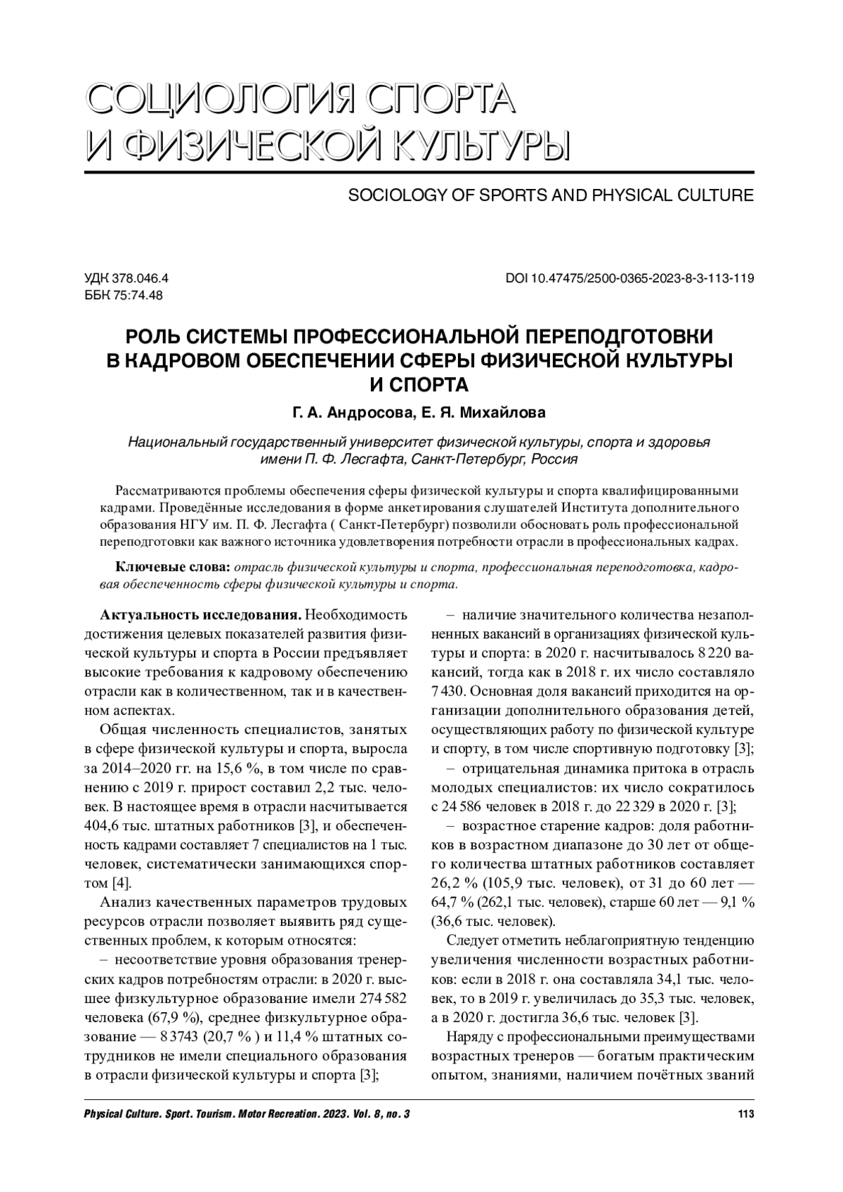 Актуальность исследования. Необходимость достижения целевых показателей развития физической культуры и спорта в России предъявляет высокие требования к кадровому обеспечению отрасли как в количественном, так и в качественном аспектах.