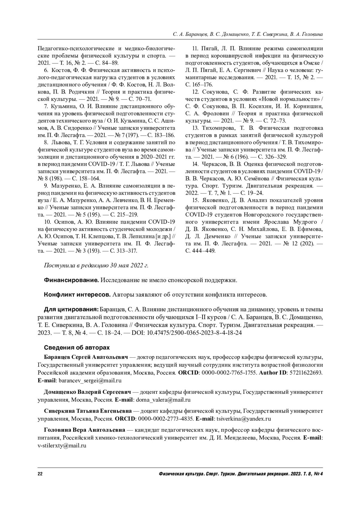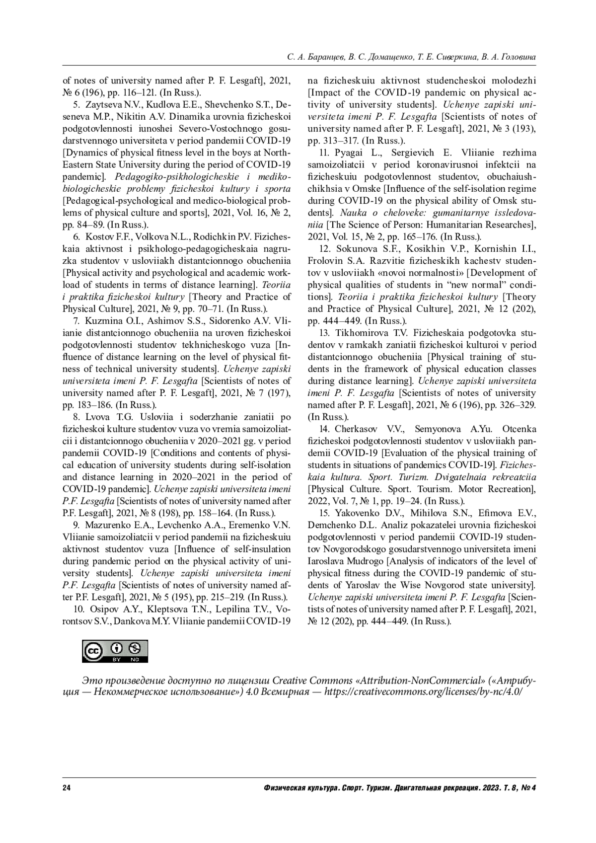 8. Львова, Т. Г. Условия и содержание занятий по физической культуре студентов вуза во время самоизоляции и дистанционного обучения в 2020-2021 гг. в период пандемии COVID-19 / Т. Г. Львова // Ученые записки университета им. П. Ф. Лесгафта. - 2021. - № 8 (198). - С. 158-164. EDN: OBDDXM