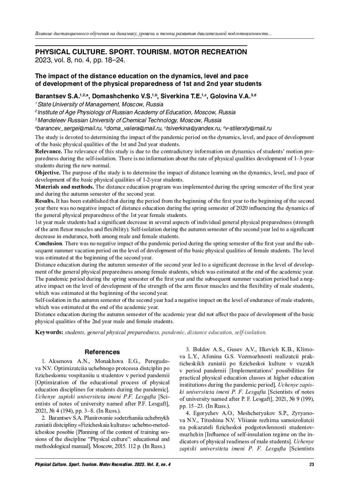 Исследование посвящено определению влияния периода пандемии на динамику, уровень и темпы развития основных физических качеств обучающихся I-II курсов. Дистанционное обучение проводилось во время весеннего семестра I курса и осеннего семестра II курса. Установлено, что за период от начала учебного года I курса до начала учебного года II курса не выявлено негативного влияния дистанционного обучения в весеннем семестре 2020 г. на динамику показателей ОФП девушек I курса. У юношей I курса отмечается достоверное снижение отдельных показателей ОФП (сила мышц - сгибателей рук и гибкость). Самоизоляция в осеннем семестре II курса привела к достоверному снижению выносливости как у юношей, так и у девушек. Не выявлено негативного влияния периода пандемии в весеннем семестре учебного года I курса и последующего периода летних каникул на уровень развития основных физических качеств девушек, зарегистрированный в начале учебного года II курса. Дистанционное обучение в осеннем семестре II курса привело к достоверному снижению уровня развития изучаемых показателей ОФП девушек, зарегистрированного в конце учебного года. Период пандемии в весеннем семестре учебного года I курса и последующий период летних каникул оказали негативное влияние на уровень развития силы мышц - сгибателей рук и гибкости юношей, зарегистрированный в начале учебного года II курса. Самоизоляция в осеннем семестре II курса оказала негативное влияние на уровень развития выносливости юношей, зарегистрированный в конце учебного года. Дистанционное обучение в осеннем семестре учебного года не повлияло на темпы развития основных физических качеств юношей и девушек II курса.