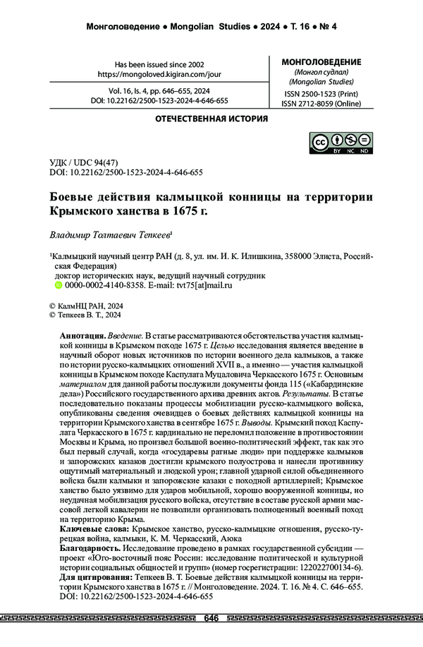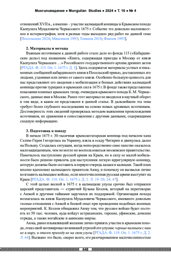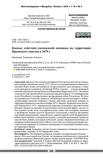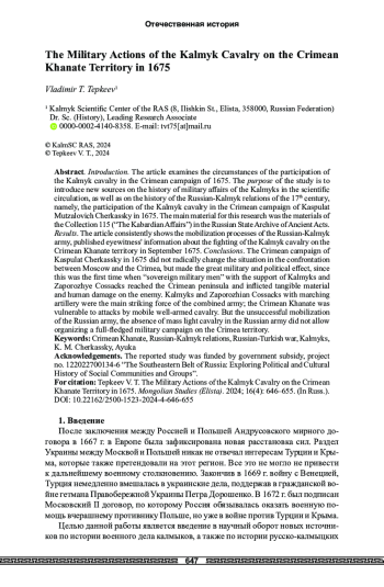 Введение. В статье рассматриваются обстоятельства участия калмыцкой конницы в Крымском походе 1675 г. Целью исследования является введение в научный оборот новых источников по истории военного дела калмыков, а также по истории русско-калмыцких отношений XVII в., а именно — участия калмыцкой конницы в Крымском походе Каспулата Муцаловича Черкасского 1675 г. Основным материалом для данной работы послужили документы фонда 115 («Кабардинские дела») Российского государственного архива древних актов. Результаты. В статье последовательно показаны процессы мобилизации русско-калмыцкого войска, опубликованы сведения очевидцев о боевых действиях калмыцкой конницы на территории Крымского ханства в сентябре 1675 г. Выводы. Крымский поход Каспулата Черкасского в 1675 г. кардинально не переломил положение в противостоянии Москвы и Крыма, но произвел большой военно-политический эффект, так как это был первый случай, когда «государевы ратные люди» при поддержке калмыков и запорожских казаков достигли крымского полуострова и нанесли противнику ощутимый материальный и людской урон; главной ударной силой объединенного войска были калмыки и запорожские казаки с походной артиллерией; Крымское ханство было уязвимо для ударов мобильной, хорошо вооруженной конницы, но неудачная мобилизация русского войска, отсутствие в составе русской армии массовой легкой кавалерии не позволили организовать полноценный военный поход на территорию Крыма.
