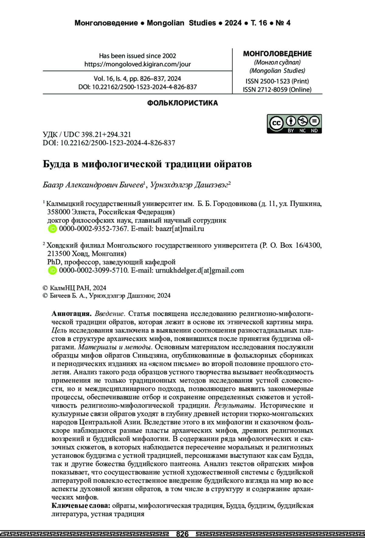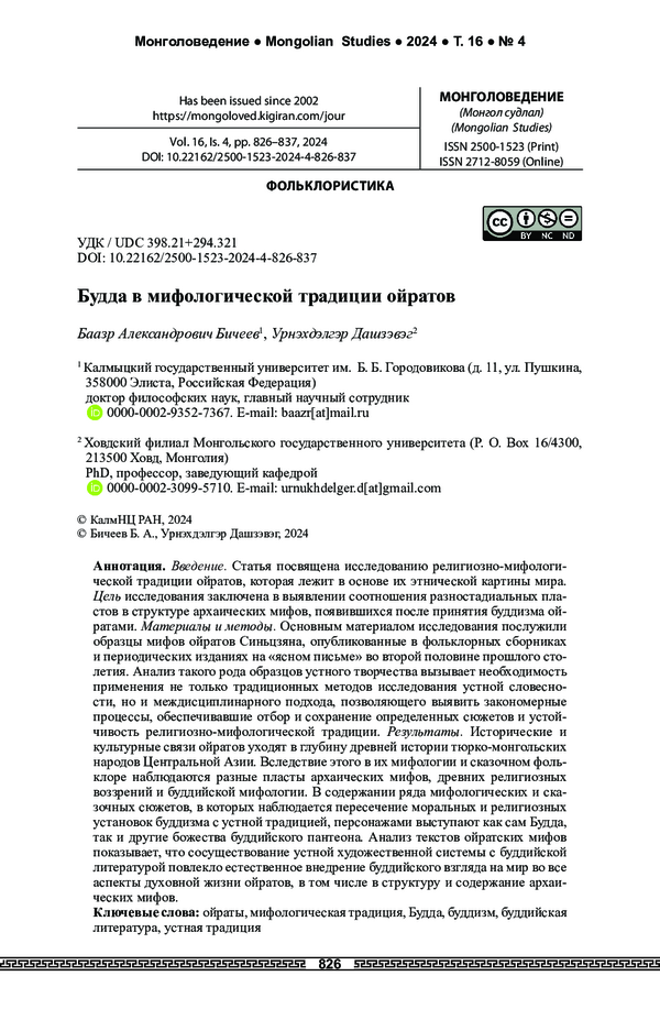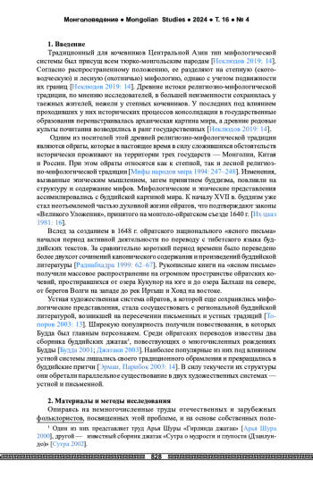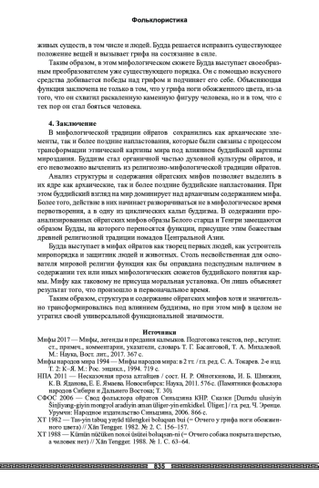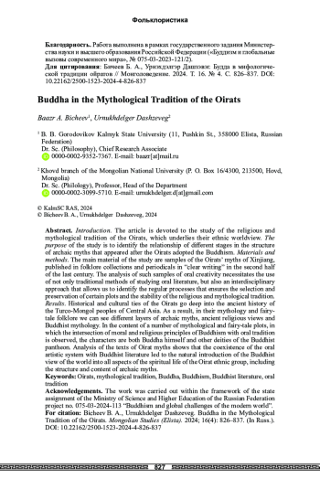 Введение. Статья посвящена исследованию религиозно-мифологической традиции ойратов, которая лежит в основе их этнической картины мира. Цель исследования заключена в выявлении соотношения разностадиальных пластов в структуре архаических мифов, появившихся после принятия буддизма ойратами. Материалы и методы. Основным материалом исследования послужили образцы мифов ойратов Синьцзяна, опубликованные в фольклорных сборниках и периодических изданиях на «ясном письме» во второй половине прошлого столетия. Анализ такого рода образцов устного творчества вызывает необходимость применения не только традиционных методов исследования устной словесности, но и междисциплинарного подхода, позволяющего выявить закономерные процессы, обеспечивавшие отбор и сохранение определенных сюжетов и устойчивость религиозно-мифологической традиции. Результаты. Исторические и культурные связи ойратов уходят в глубину древней истории тюрко-монгольских народов Центральной Азии. Вследствие этого в их мифологии и сказочном фольклоре наблюдаются разные пласты архаических мифов, древних религиозных воззрений и буддийской мифологии. В содержании ряда мифологических и сказочных сюжетов, в которых наблюдается пересечение моральных и религиозных установок буддизма с устной традицией, персонажами выступают как сам Будда, так и другие божества буддийского пантеона. Анализ текстов ойратских мифов показывает, что сосуществование устной художественной системы с буддийской литературой повлекло естественное внедрение буддийского взгляда на мир во все аспекты духовной жизни ойратов, в том числе в структуру и содержание архаических мифов.